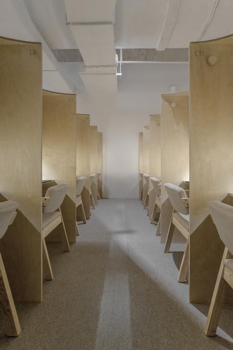 The two-story cabins in the center of the open study area are designed to be double study rooms. We chose a translucent material as the enclosure of the first floor of the cabins to increase the hierarchy of the space, while maintaining the visual translucency. And the second floor is enclosed with wood panels to give more security.