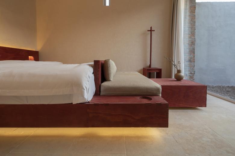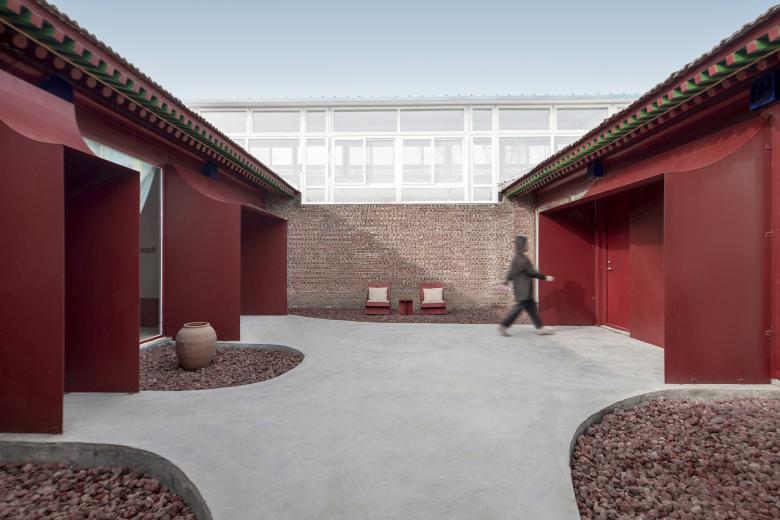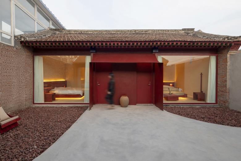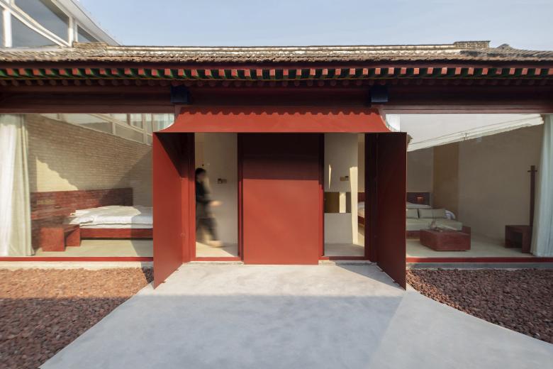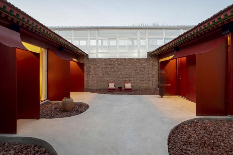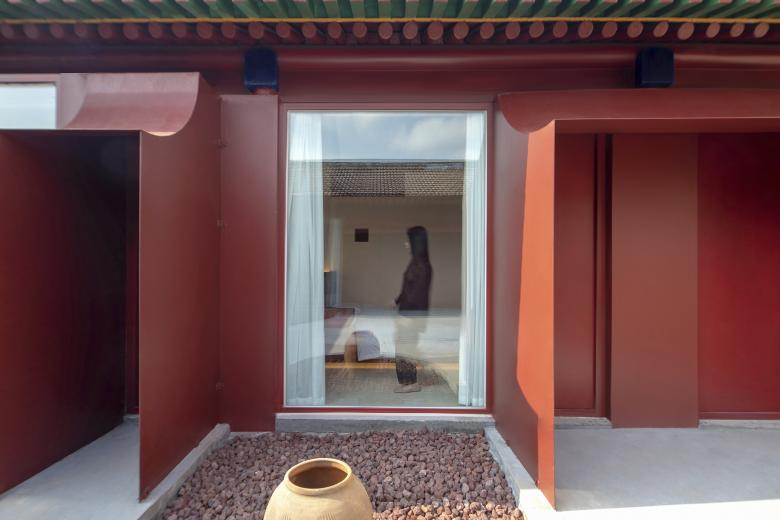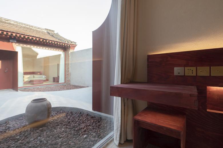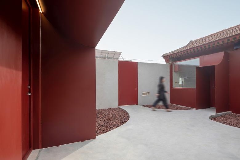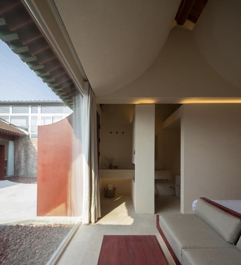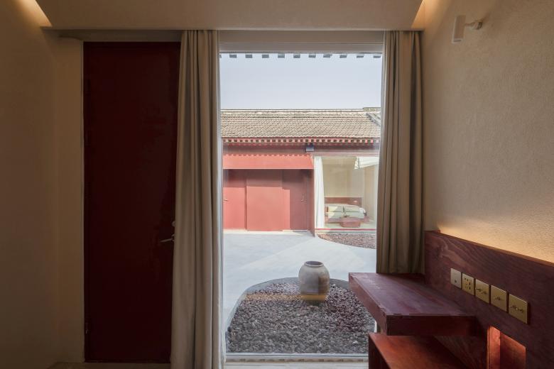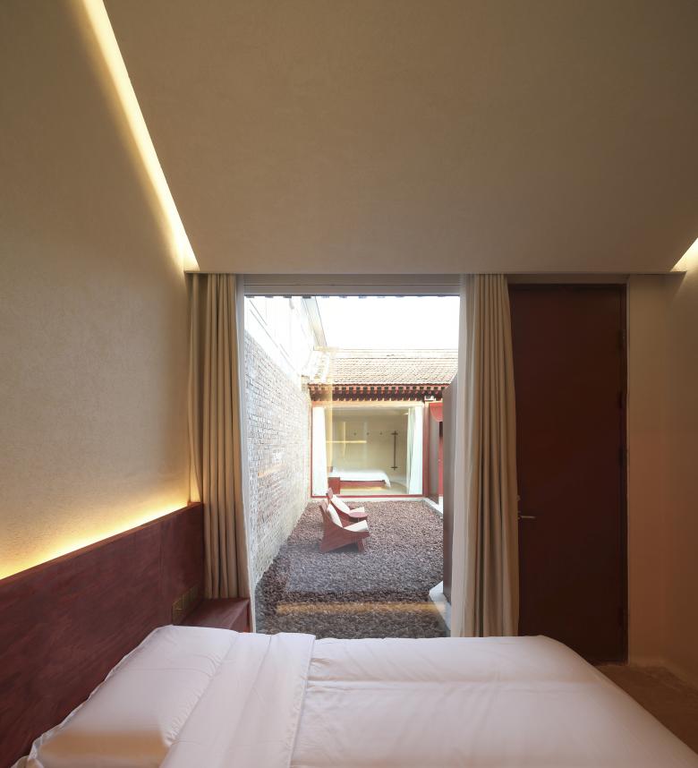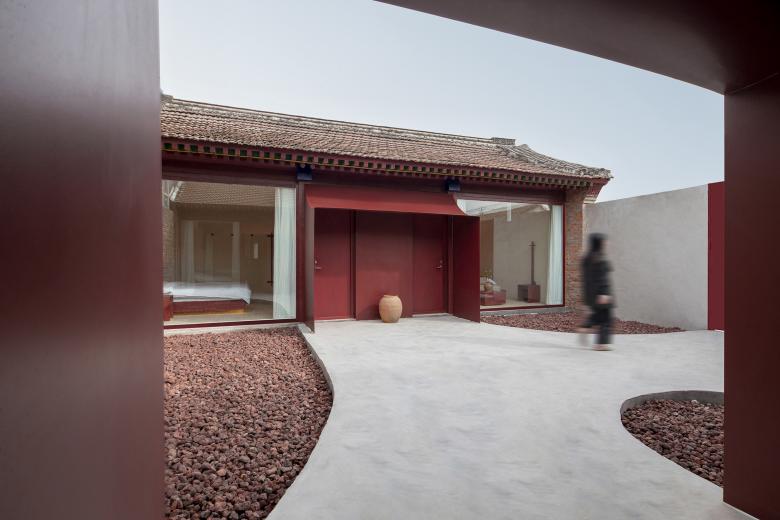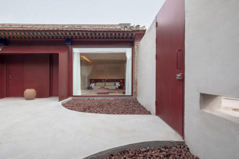 我们在庭院中引入一条主轴,以曲线的形式勾勒出几条岔路,分割出四个不同尺度的内部庭院。在视觉上营造出空间层次感,也在功能上实现了灵活性和可变性。红色火山石铺就的景观区为建筑增添了一抹别致的色彩,而水泥路面则流向各个客房空间,引导着客人行走的方向和空间范围。此外,我们用具有张力的几何形状构建了客房入口,使其具有一种新京味儿的入场仪式。室内原本面向院子的墙体被拆除后,大面积的落地玻璃代替了相对封闭的窗墙体系,室外庭院与室内空间就此成为交替的风景。