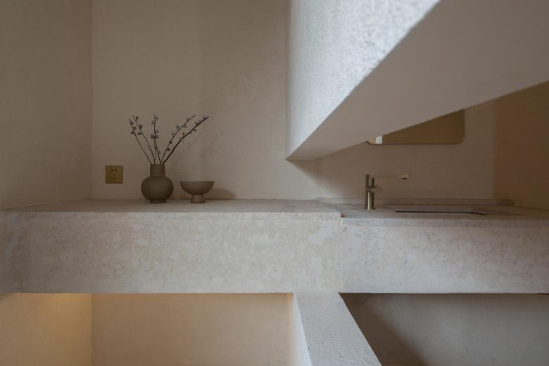 我们试图在现代的脉络里展现古老的韵律,用空间让时间的记忆共生。在旧有建筑的坡屋顶下,将屋脊部分打开,展露出原有的木梁,又在屋顶剖面关系上做出变化,用曲面勾勒出传统的坡屋顶形象,将古老的建筑语言融入现代的空间里,让历史在现代里得以传承。在这个4.1米挑高的空间下,我们设计了柔和的间接照明,每一条光线都在勾勒空间的轮廓,给人以具有精神性的空间体验。