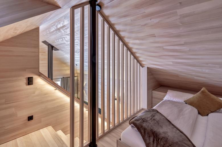 Im Zuge der Planung wurden die Urlaubshäuser in natürlich wirkenden Gruppen und das Haupthaus auf dem Grundstück aufgefächert, damit jedes Gebäude die bestmögliche Aussicht erhält. Platzsparend und daher orthogonal zu den Schichtenlinien positioniert, saugen die zweigeschoßigen Chalets mit ihrer trichterähnlich geformten Stirnseite das Landschaftspanorama an. Von Vorteil ist diese Konfiguration in ihrer Ambivalenz, weil sie nicht nur Ausblick bietet, sondern auch vor Einblicken von der Seite zu schützen vermag. Daher ist es konsequent, wenn nun das Versetzen der geschoßhohen Fenster die Axialität der Stirnseite relativiert. Städtebau findet auch auf dem Land statt, so könnte man die Organisation der kleinen Siedlung beschreiben. In Zeiten der Zersiedelung des Alpenraumes ein umso wichtiger Aspekt dieses Projekts. Die primäre Botschaft der Architektur, nämlich Struktur und Aussicht zu optimieren, wird mit ergänzenden Themen konjugiert: Tatsächlich und sehr bildhaft beschützt das überragende Dach, es nimmt den gesamten ersten Stock bis zum Fenstersturz ein, wobei eine weitere Öffnung nach oben hin, den Fernblick aus der Horizontalen in die Vertikale überträgt. Diese Laterne erfüllt das Obergeschoß mit natürlichem Licht, bewirkt aber noch mehr: Das Licht unterstützt die Plastizität des Daches und streicht über das Relief des verwendeten Materials - Holz. Damit wird wieder eine kleine Irritation eingebracht, ist doch die Verwendung des natürlichen Werkstoffes produktionsbedingt nicht die erste Wahl, wenn es darum geht das Körperhafte der Architektur herauszuarbeiten. Der Dialog von Licht und Material wird auf eine subtile Ebene transformiert, sodass das oft Plakative des Bauens in den Bergen in den Hintergrund rückt. Die grundlegende Komplexität, welche Baumschlager Eberle Architekten mit den kleinen Chalets herausgearbeitet hat, «funktioniert» im größeren Maßstab beim Haupthaus, das als Orientierungspunkt in der Landschaft wirkt.