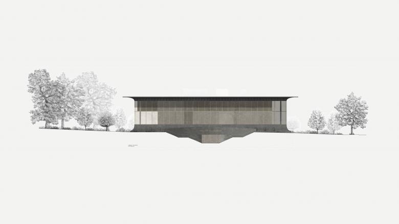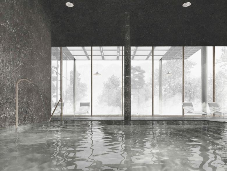 Das Gebäude folgt dem Entwurfsbild des gesockelten, eines auf Steinen ruhenden, hölzernen Pavillons im Park, der bei größtmöglicher Intimität mit der Landschaft und der umliegenden Bergwelt verschmilzt. Das räumliche Konzept der Therme beruht auf einem im Inneren ausgehölten, bergenden Sockel, der die darauf befindliche Bäderebene subtil vom umspülenden, öffentlichen Parkraum entrückt , und auf dem sich über 2 Geschosse erstreckende Steinblöcke situiert werden, die sowohl die hölzerne Dach-Raum-Struktur als auch das aufgelagerte, autark entkoppelte Sauna- und Wellnessgeschoß in Holz tragen. Umschlossen wird diese gesamte Raumstruktur von einer metallenen Fassade, die die thermische Hülle bildet. Den notwendigen Sichtschutzfilter des eingehängten Holzgeschosses bildet, wo notwendig, ein mattierter Verlauf der Innenfassaden. So entstehen in sich verschränkte Innen- und Außenräume, die dieses Fügen der Materialien und Konstruktionen mit allen Sinnen erlebbar machen. Dem Gedanken des vom Wasser gehölten Steins folgend, entwickelt sich das Raumgefüge nach dem Abtauchen im Park zum Licht hin, um auf dem Sockel mit größtmöglichem Park- und Bergbezug aufzutauchen, oder um durch die auf dem Sockel liegenden Steine das auflagernde, durchdrungene Holzgeschoß zu erschließen, das sich ebenfalls sowohl innen- als auch außenräumlich mit allen Strukturen verzahnt und als Mittler zur krönenden Dachlandschaft fungiert.