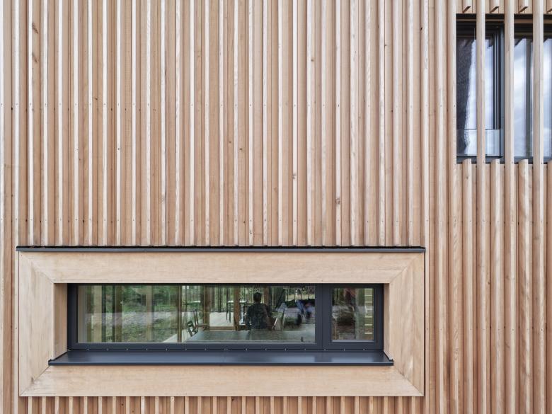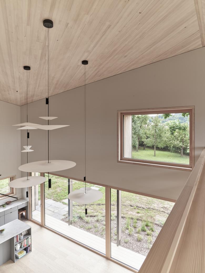 Im einfachen, dichten Volumen sind sämtliche Funktionen des täglichen Lebens integriert. Um den mittig im Gebäude situierten und via Zenitallicht belichteten Treppenhauskern fächern sich die Raumzonen auf verschiedenen Ebenen auf. Vielfältige Blickbeziehungen schaffen Verbindungen quer über alle Raumschichten. Präzis gesetzte Öffnungen integrieren den Naturraum im Inneren und geben immer wieder überraschende Blickbeziehungen frei. Zum Oberlicht hin falten sich die Deckenelemente und formen ein windmühlenartiges Dach - ein richtungsloses, verwurzeltes Gebäude entsteht, das nach allen Seiten kommuniziert. Gefilterte Holzelemente graduieren Privatheit, Lichteinfall und schaffen eine atmosphärische Dichte.