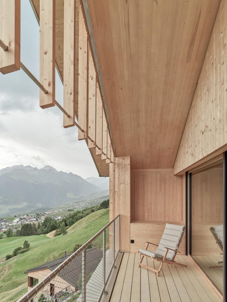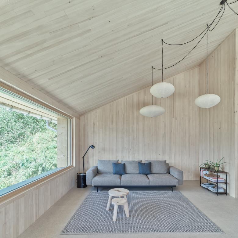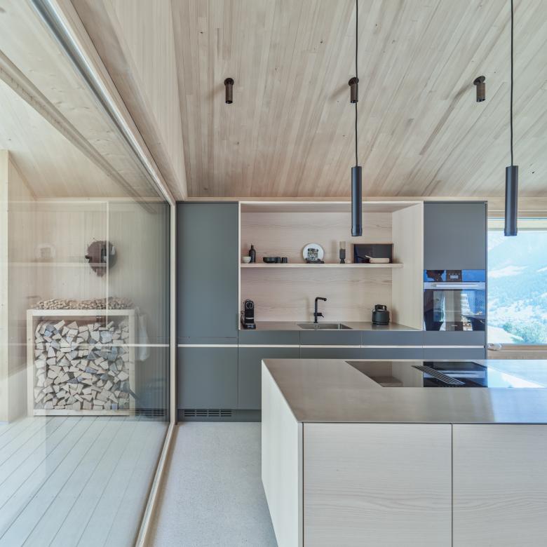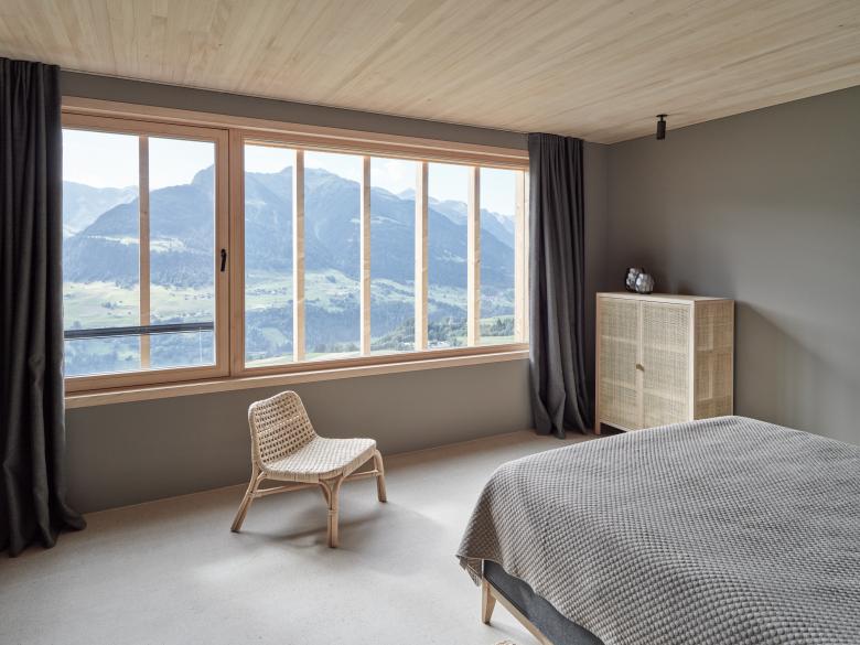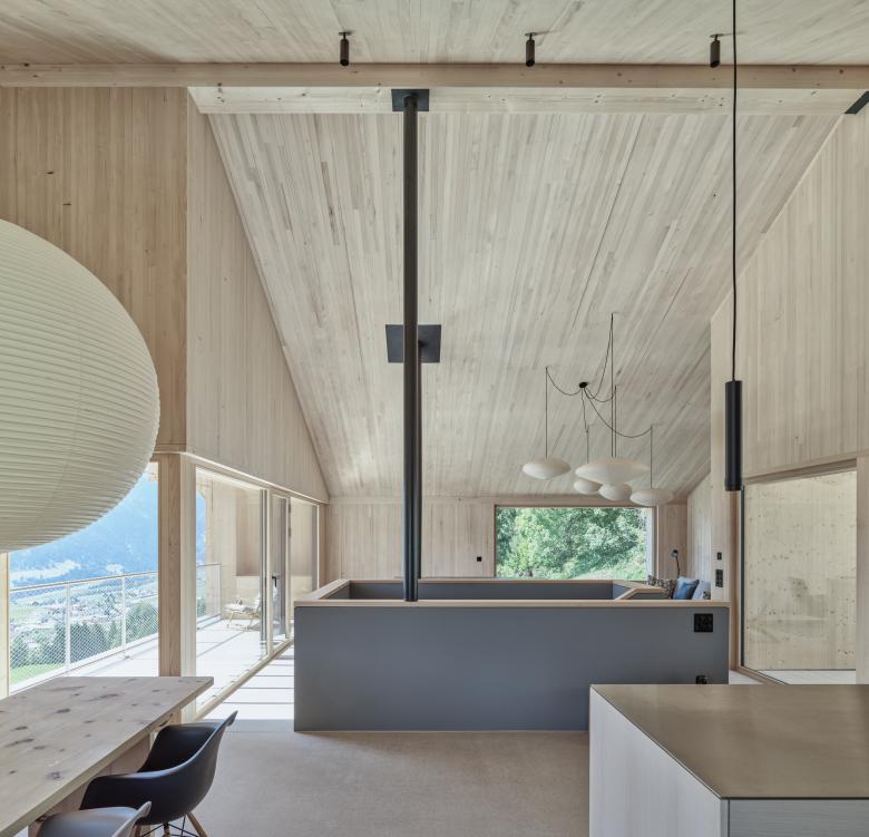 Fernab städtischen Trubels inmitten der Alpen fügt sich das Haus unaufgeregt in die Siedlungslandschaft ein. Als klar konzipiertes Haus aus leimfreien Massivholzelementen folgt es den Grundsätzen des zirkulären Bauens. Um eine im Kern des Hauses situierte Treppe fächern sich die Raumzonen auf und greifen geschossweise ineinander. Präzise Aus- und Durchblicke ergeben vielfältige Sichtbeziehungen. Die Fassade aus unbehandelter Weisstanne verleiht dem Baukörper eine fein nuancierte Struktur.