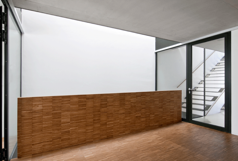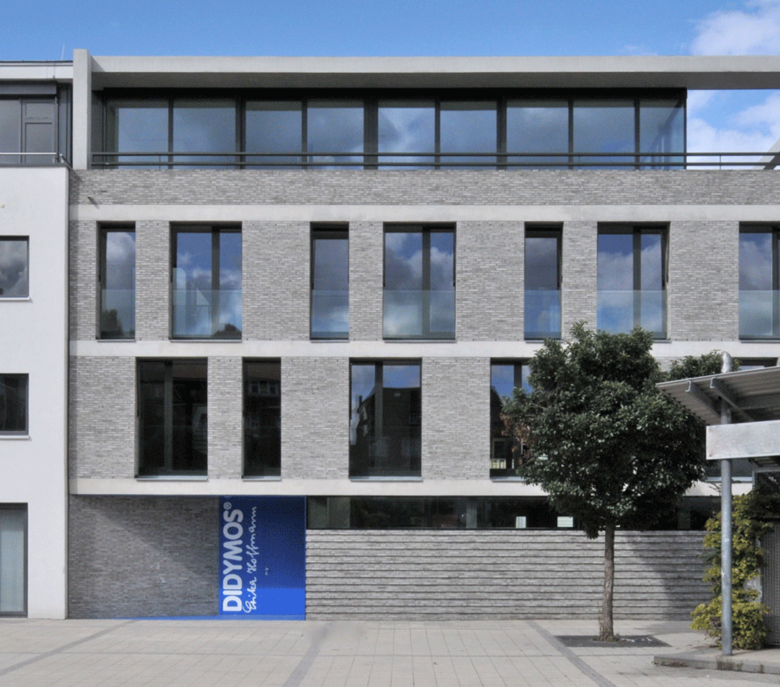 Eine Baulücke zu schließen war die Planungsgrundlage dieses Projektes, denn der Neubau eines Firmensitzes sollte nicht in einem gesichtslosen Gewerbegebiet mit schlechter Anbindung an den öffentlichen Nahverkehr entstehen, so der Wunsch der Bauherrschaft. In dem 4-geschossigen Gebäude musste ein umfangreiches Raumprogramm mit unterschiedlichsten Nutzungen untergebracht werden bei gleichzeitig hoher Flexibilität um wechselnde Organisationsformen realisieren zu können. Der Hauptzugang, an einem städtischen Platz gelegen, präsentiert sich als Einschnitt ins Gebäude im „typischen Firmenblau“. Lufträume im Haus verbinden die auf mehrere kleine Flächen verteilten Nutzungen.