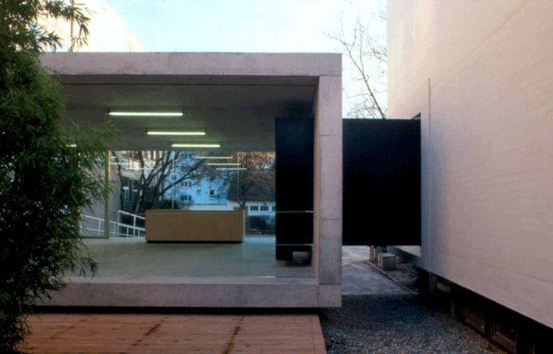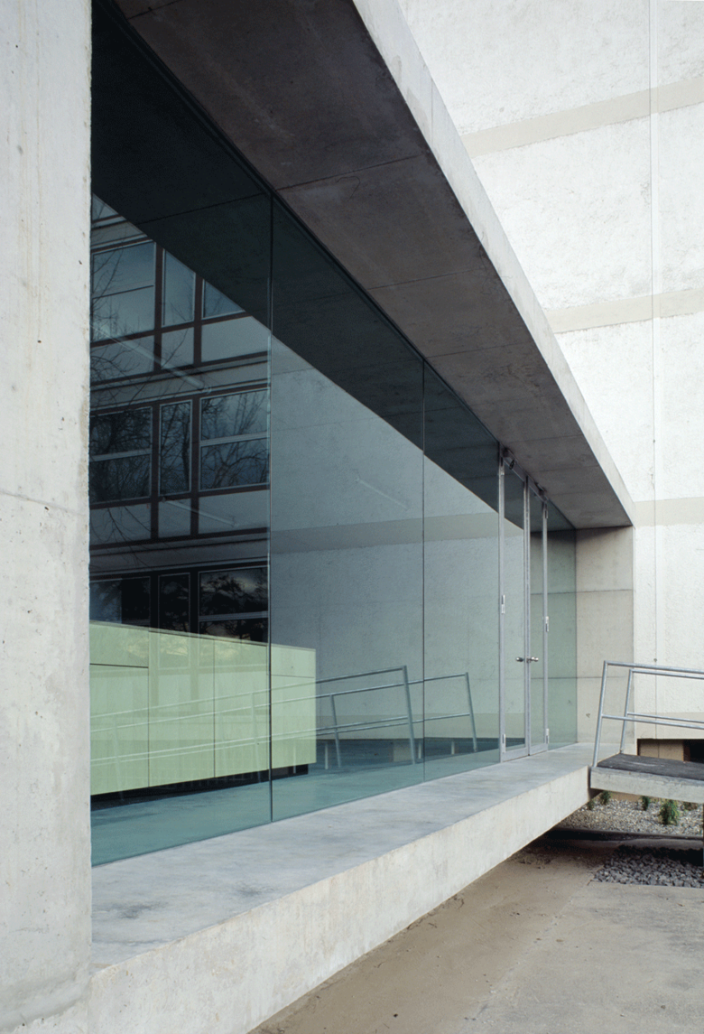 Eine Überdachung, ein Bäckereistand und eine kurze Wegeverbindung zwischen Schule und Sporthalle waren Planungsinhalt dieser kleinen Bauaufgabe. Auf einem Sockel schwebt ein Rahmen aus Sichtbeton, Schleusen aus Stahl dienen als Verbindungselemente. Um zwischen den Höhenunterschieden zu vermitteln, wurde das Fußbodenniveau des Betonkörpers tiefer als die bestehenden Gebäudeteile gesetzt. Die Differenzen werden innerhalb der Schleusen aufgenommen. Eine Rampe aus Asphalt schiebt sich von außen an den Körper heran. Aus den zusammengesteckten Einzelteilen ergibt sich ein neues Ganzes.