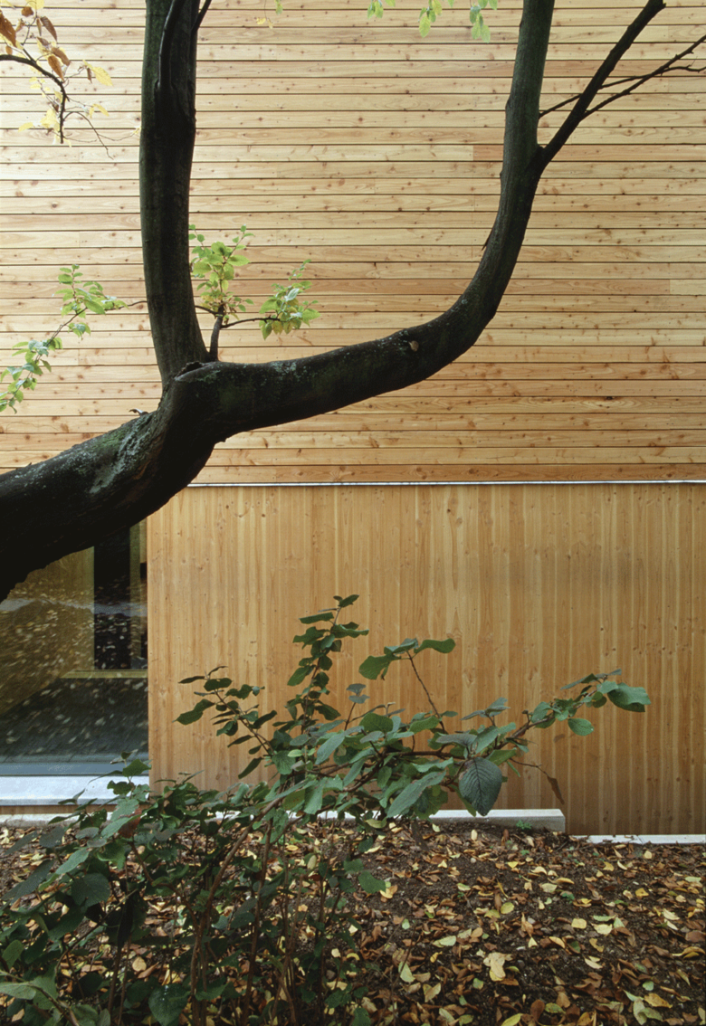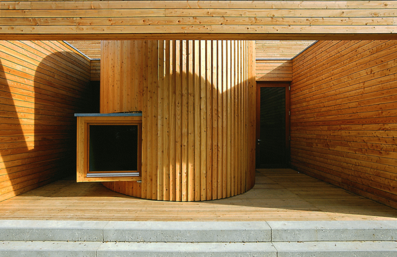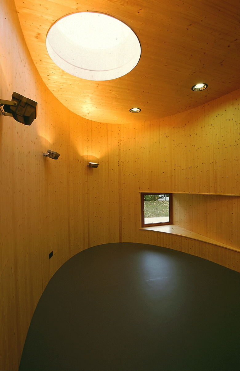 Der Kindergarten, ein reiner Holzbau, der in Massivbauweise mit großformatigen Wandpaneelen erstellt wurde, steht auf einem parkähnlichen Grundstück im Ludwigsburger Stadtteil Eglosheim. Das einfache additive System von Wand- und Deckenelementen sowie der hohe Vorfertigungsgrad erlaubten eine kostengünstige Konstruktion. Das offene Betreuungskonzept spiegelt sich in der Architektur wider: sehr unterschiedliche Räume wie Gruppen-, Werk- und Sanitärräume gruppieren sich um eine zentrale Multifunktionsfläche. Optisch markant ist der mittig angelegte ellipsenförmige Raum, der ausschließlich der Wahrnehmung von akustischen und optischen Reizen dient.