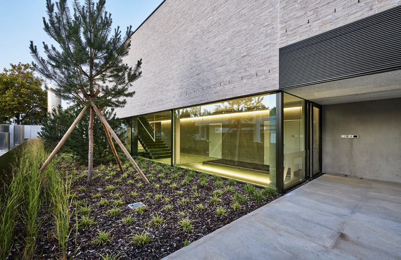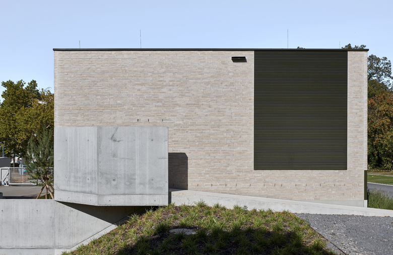 Der Neubau des Zentrums für Einsatztraining mit Raumschießanlage ist an der östlichen Grundstücksgrenze des bestehenden Polizeipräsidiums angeordnet. Das dreigeschossige Gebäude bildet den Abschluss des bestehenden, mit einer Tiefgarage unterbauten Polizei-Betriebshofes. Das Raumprogramm wird auf 3 Geschossebenen verteilt. Die oberen Geschosse enthalten die Trainings- und Seminarräumen, während sich im Untergeschoss die 25-Meter lange Raumschießanlage befindet. Aufgrund seiner Nutzung erhält das Gebäude einen stark introvertierten Charakter mit sehr wenigen Fensteröffnungen. Das betont grob verarbeitete Mauerwerk verleiht den geschlossenen Wandflächen Struktur und Ausdruck.