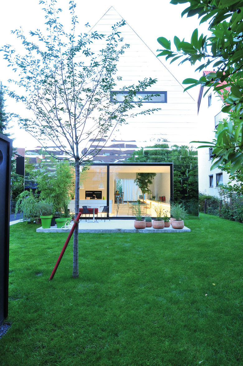 Die beiden Fassadenelemente im Erdgeschoss lassen sich im Sommer fast vollständig öffnen, sodass der Wohn- und Essbereich mit dem vorderen und hinteren Garten zur Einheit wird.