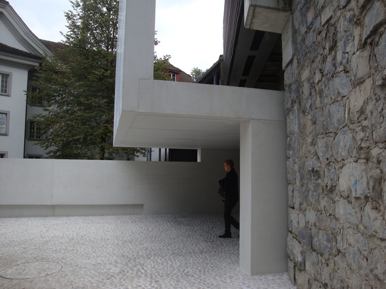 Das Dach liegt auf den schräg zurückversetzten Wandscheiben auf. Die auskragende, über 8.50m hohe Wand, in die zur Gewichtsreduktion leere Lüftungsrohre einbetoniert wurden, steht auf der Vorderkante der Decke.