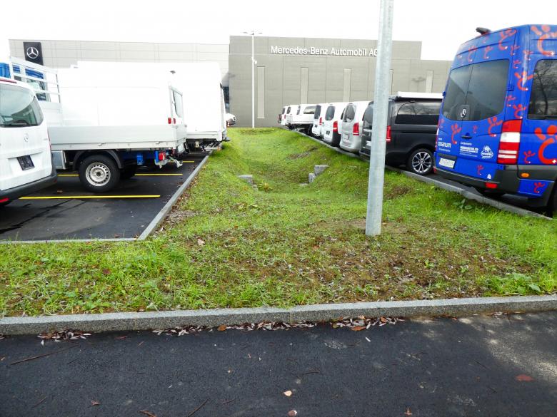 Die Umgebung (21‘000 m2) wird für die Fahrflächen, Manövrier- und Parkfelder gestaltet. Dazu werden auch die oberirdischen Versickerungsanlagen miteingebunden. Nach Art der Belastung werden die Beläge diversifiziert in Asphalt oder Beton erstellt. Die Grünflächen werden mit Bäumen und unterhaltsarm ausgestaltet. Mittels örtlicher Versickerung und dem Retentionsbecken wird die Oberfläche entwässert. Für die Entwässerung werden zirka 1‘000 m Entwässerungsrohre und 50 Schächte aller Art benötigt.