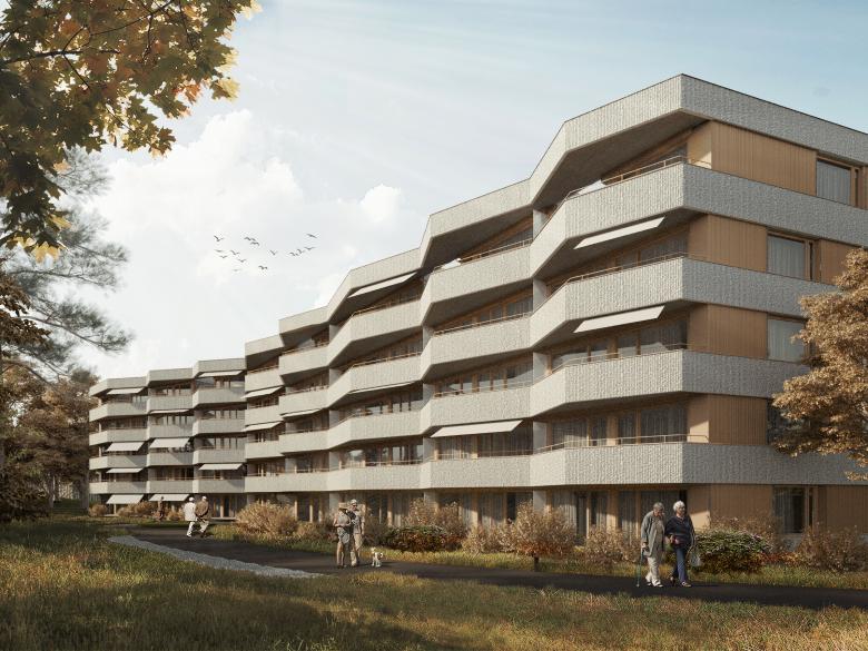 Der Neubau bestehend aus zweigeschossiger Einstellhalle und einem langgezogenen fünfgeschossigen Wohngebäude ist in den steilen Hang eingebettet. Das Gebäude ist mit Ortbeton Flachdecken ausgeführt. Die sehr weit auskragenden Balkone ergeben komfortablem Aussenraum für die Wohnungen und prägen die Fassade.