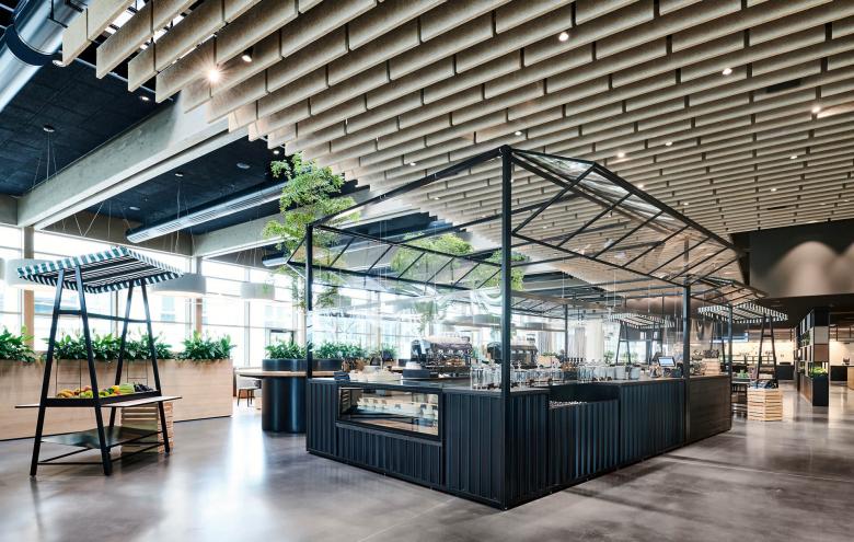 Im Herzen des Restaurants: der sogenannte Marktplatz, eine Cafébar fürs zwanglose Get-Together oder die kleine Pause zwischendurch. Das fließende Moment der verschiedenen Bereiche setzt sich auf der Terrasse fort, die 360 Sitzplätze bietet. Die Bodenbeläge der jeweiligen Bereiche ziehen sich bis draußen und verlängern so den Raum wie selbstverständlich ins Grüne. Eine Oase für einen Lunch in der Mittagssonne, ein gemütliches Afterwork oder informelle Meetings.