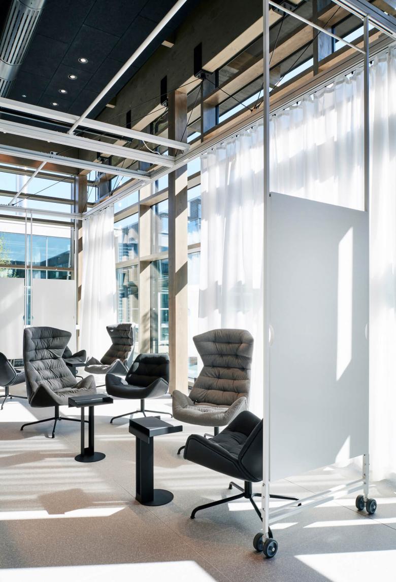 So finden sich neben abgerundeten Sitzinseln und kleineren Tischgruppen, die zum klassischen Mittagessen im engeren Kollegenkreis einladen, auch Bereiche, die einen Business-Lunch ohne Ortswechsel kurzerhand in ein Meeting übergehen lassen. Hierfür können zum Beispiel Trennwände, Tafeln und Clip-Charts an der flexiblen Deckenschiene Multi-Lane abgehängt werden. Selbst für größere Veranstaltungen oder „State of the World“-Meetings wurde Raum geschaffen: Ausziehbare und flexible Tribünen ermöglichen verschiedene Raumszenarien.