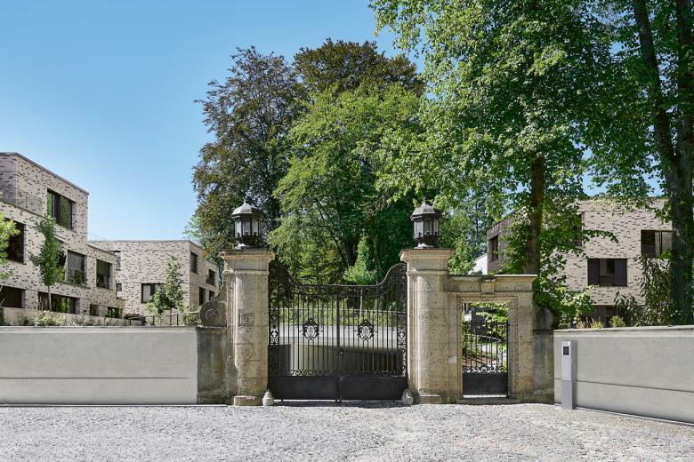 Das Ensemble kompakter Villen mit Dachterrassen ist dabei großzügig in das rund 9.000 qm große Grundstück mit vorhandenem Baumbestand eingebettet. Dem Charakter der Gartenstadt Harlaching entsprechend, einem der teuersten Münchner Stadtbezirke, besticht die Bebauung durch größtmögliche Individualität und Exklusivität. Statt der Natur möglichst viele Quadratmeter Geschossfläche abzuringen, verteilen sich auf dem herrschaftlichen Anwesen fünf streng geometrisch angeordnete Kuben mit insgesamt 28 Wohneinheiten in der Sprache der klassischen Moderne.