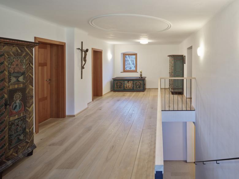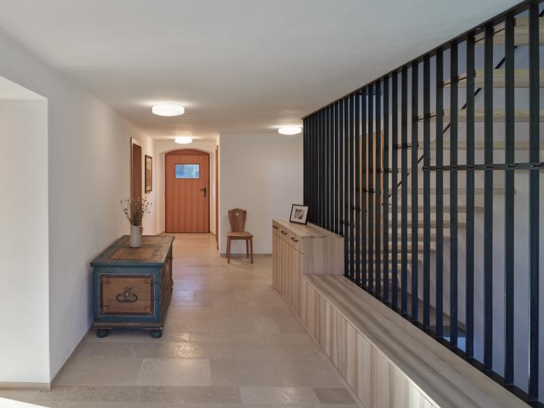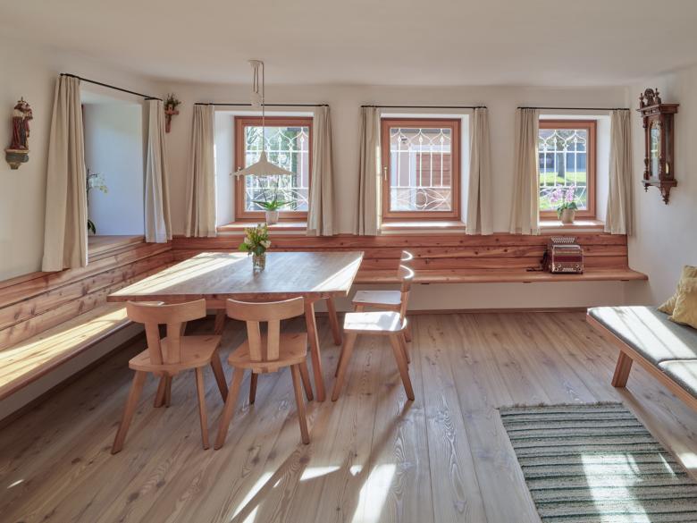 Nachdem aktuell drei Generationen hier leben und nach wie vor Ackerwirtschaft betrieben wird, war der Hausstock während der Umbaumaßnahmen ständig bewohnt. Dies erforderte ebenso Augenmerk in der Planung und Umsetzung wie der Umgang mit dem traditionellen Charakter des Hofes. Diesen zu erhalten war oberste Prämisse. Die Wände wurden mit Kalkglätte versehen, als Boden kamen breite Massivholzdielen sowie Naturstein zum Einsatz. Die Fenster aus Lärchenholz fügen sich von außen in das historische Aussehen, innen tragen sie zu einem angenehmen und gemütlichen Raumklima bei. Bestehende Fensterkreuze wurden saniert und wiederverwendet. Für die Haustüre haben wir uns in der Umgebung auf die Suche nach einem historischen Vorbild gemacht. Fündig geworden sind wir auf einem alten verfallenen Hof. Eine der dortigen Türen haben wir als Schablone für die ‚Neue‘ verwendet.