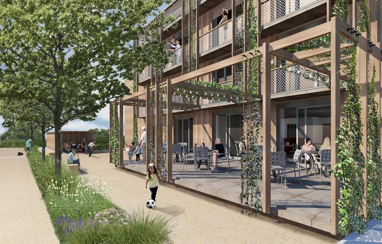 Die Fassade ist als Holzelementbau konzipiert und ermöglicht bei minimalen Konstruktionsstärken sehr gute Wärmedämmkennwerte und einen hohen Grad an Vorfabrikation. Eine äussere Raumschicht bilden die vorgelagerten ortbetonierten Balkonelemente. Diese werden an den Gebäudeecken unterbrochen, wo grossflächig die vertikale Holzschalung zum Ausdruck kommt. Die äusserste Ebene der Fassade besteht aus einem Rankgerüst, der die Raumschicht mit seiner Fassadenbegrünung abschliesst. Jedes Zimmer ist dadurch vor direkter Sonneneinstrahlung und Überhitzung geschützt und geniesst ein Wechselspiel von Licht und Schatten.