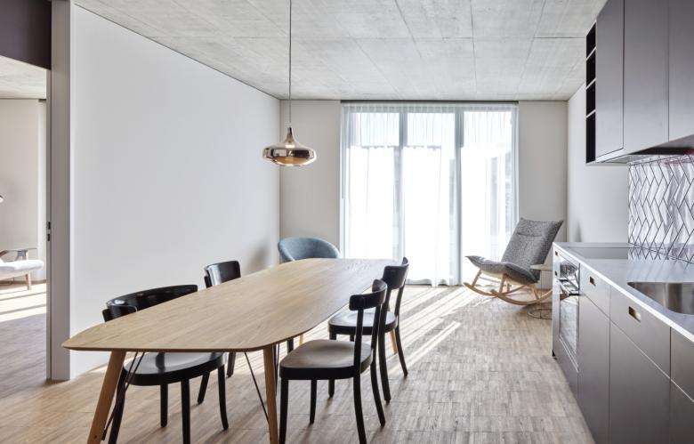 Der Gebäudeentwurf basiert auf einem Grundraster von 4.20x 4.20 m und ermöglicht Raumgrössen von über 16 m2. Die nahezu quadratischen, an der Aussenfassade liegenden Räume sind sehr hell und bieten eine grosse Nutzungsneutralität für die Bewohner und Bewohnerinnen. Die Nasszellen befinden sich in einer zweiten Raumschicht. Das gewählte statische Konzept mit aussteifendem Kern und Fassadenstütze bietet eine maximale Flexibilität sowohl in der Planung wie im Betrieb des Gebäudes. Das heisst, der Wohnungsmix kann angepasst werden und auch auf sich ändernde Bedürfnisse kann später mit einfachen Massnahmen reagiert werden.