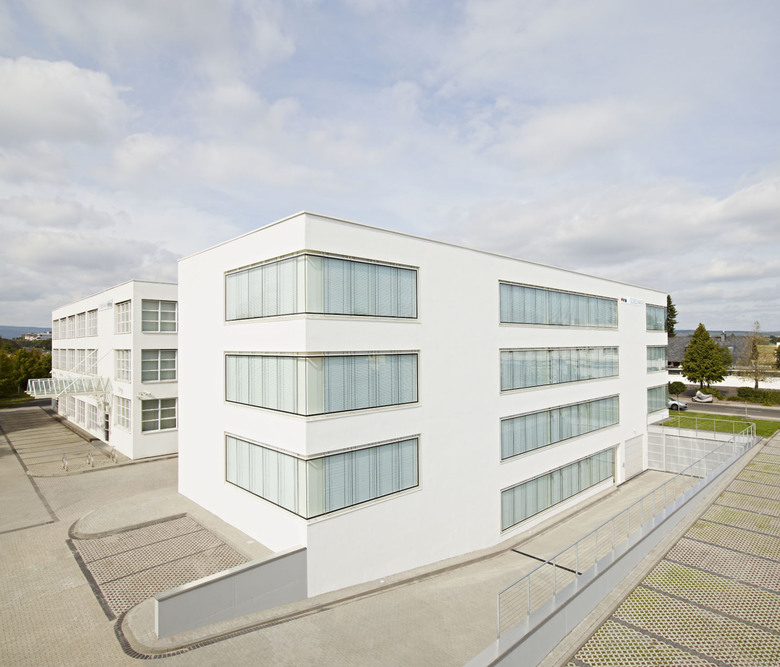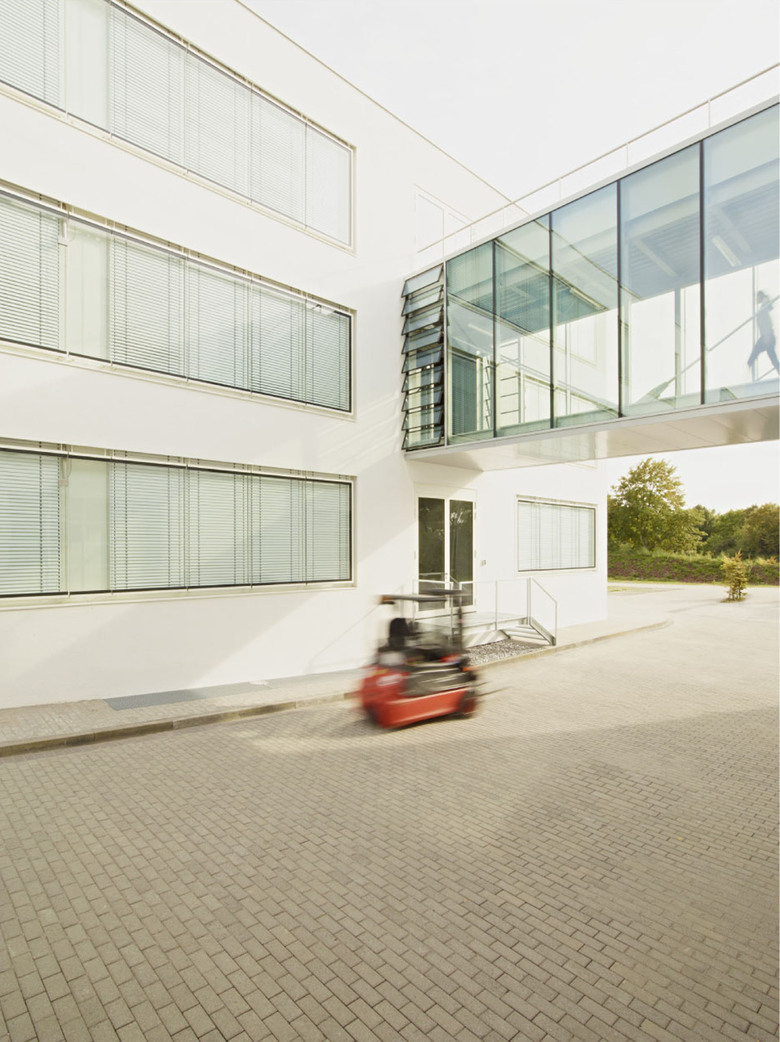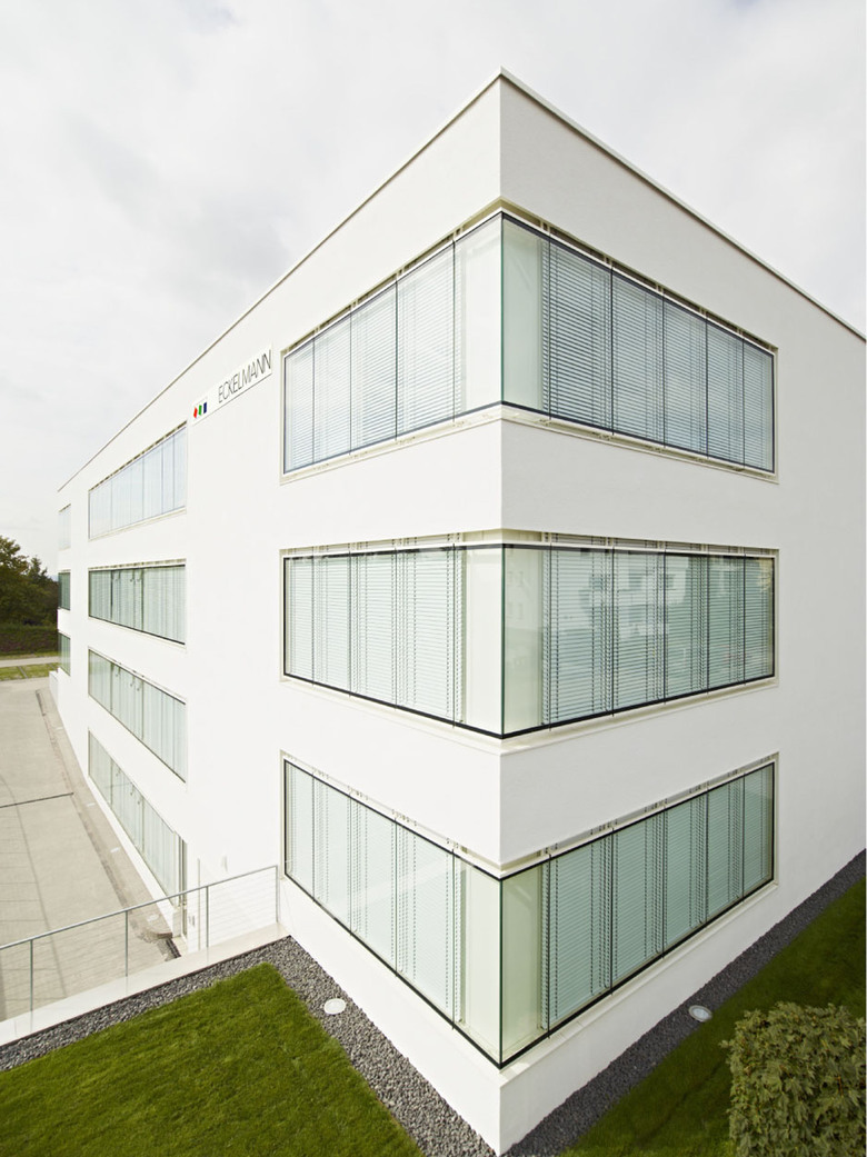 Das klar konturierte Gebäude geht in seiner Größe, Höhe, Proportion und mit der Position seiner Fensterbänder auf die Bestandsgebäude ein. Es unterstützt und ergänzt das bestehende Ensemble, wird aber im Sinne, dass das einzig Konstante der Wandel ist, durch seine neue zweischichtige Fassade zum sichtbaren Zeichen für die Weiterentwicklung der Eckelmann AG.
