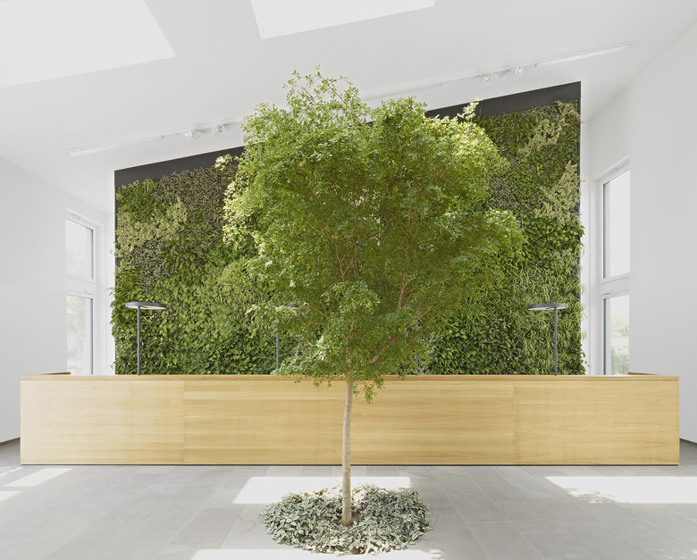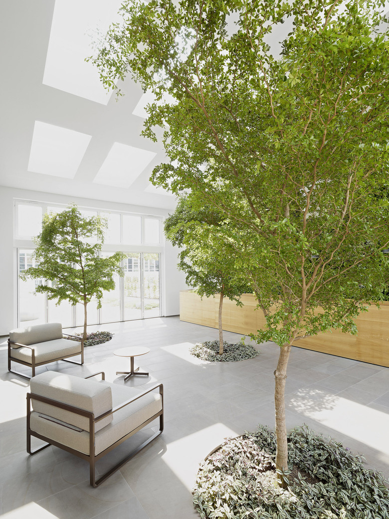 - Die Empfangs- und Ausstellungshalle wurde mit Bäumen bepflanzt und die