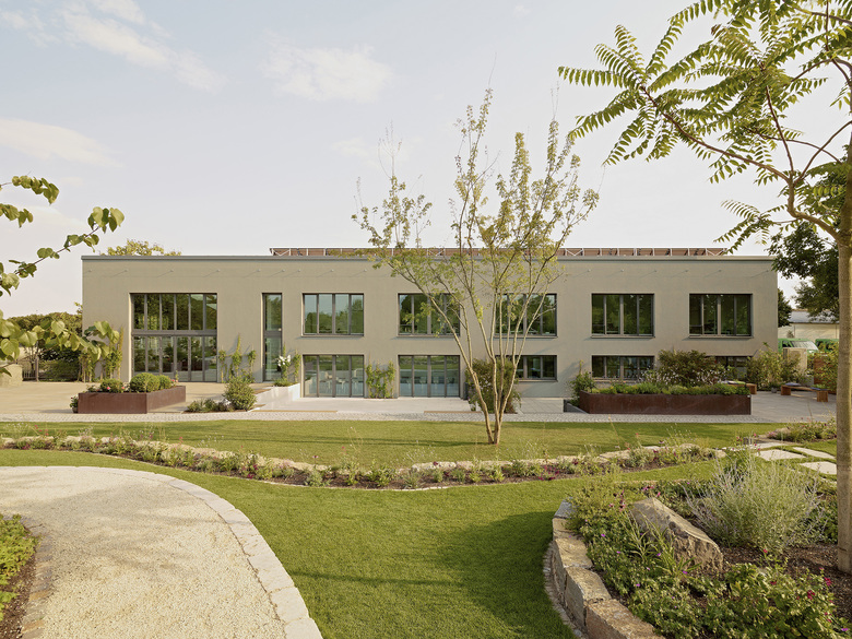 Das neue Bürogebäude ist am Rande von Wiesbaden, umgeben von landwirtschaftlich genutzten Feldern, gelegen. Der einfache Baukörper mit Pultdach passt sich in seiner Formensprache an die umliegenden landwirtschaftlichen Bauten und an die bestehenden Betriebsgebäude an. Im Gebäude sind neben Büroräumen ein großer unterteilbarer Konferenzraum sowie die Empfangs- und Ausstellungshalle untergebracht.
