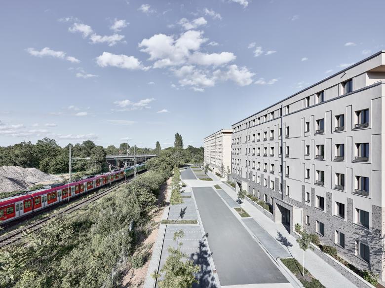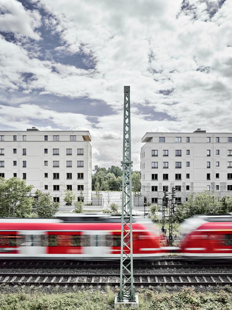 Das nördliche „Rückgrat“ des Quartiers bildet eine sechsgeschossige, geschlossene Bebauung, welche das Wohngebiet zur Bahntrasse und Kostheimer Landstraße abschirmt und eine klare Raumkante zur Quartiersstraße bildet. Hier entstehen in drei Baukörpern zusammengefasst acht Mehrfamilienhäuser mit 172 Wohneinheiten.