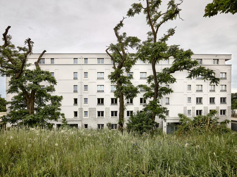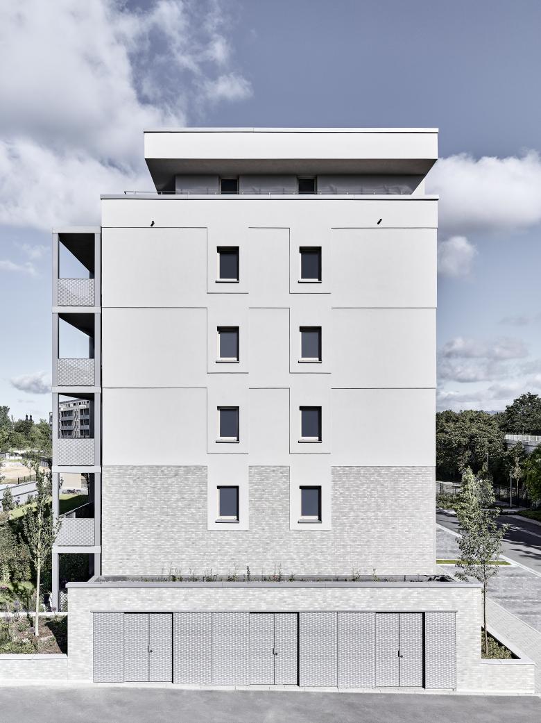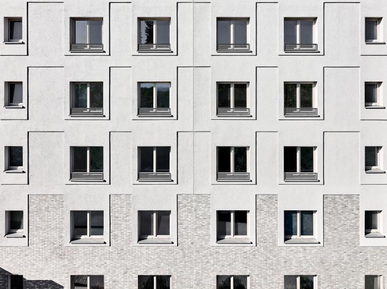 Um die typische Monotonie von Zeilenbauten aufzubrechen, wurde ein rhythmisiertes Putzrelief entwickelt. Durch die sich schuppenartig überlappenden Putzfaschen wird die Fassade horizontal und vertikal gegliedert und ein abwechslungsreiches Schattenspiel erzeugt. Die in der Höhe sich überlappenden Putzflächen vermeiden horizontale Vorsprünge, auf welchen sich Wasser sammeln und das Material angreifen kann. Die Form des Reliefs ergibt sich folglich aus den funktionalen Eigenschaften des Materials.