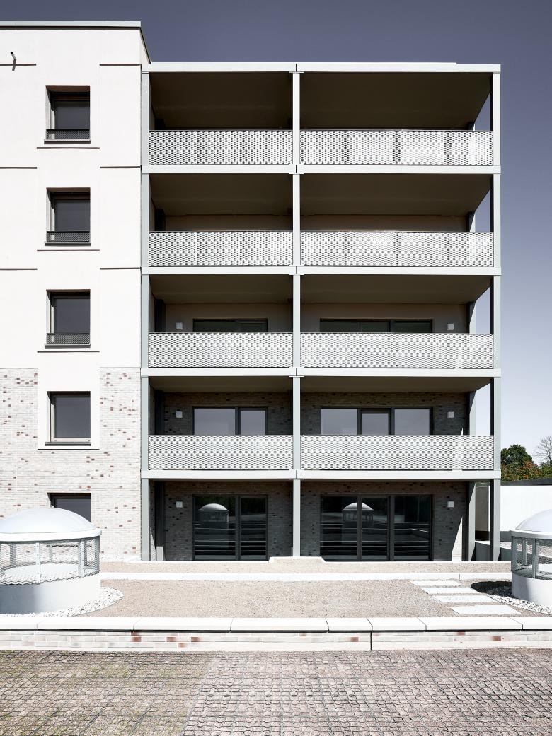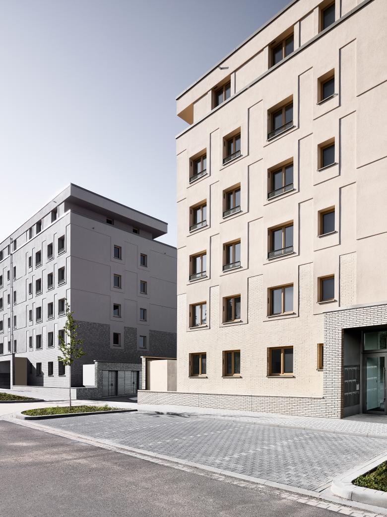 Die Gebäude haben einen klinkerverkleideten Sockel über zwei Geschosse und eine auf die jeweilige Klinkerfarbe abgestimmte helle Putzfassade. Die unterschiedlichen Gebäudefarben (Braun, Beige und Grau) erzeugen – bei prinzipieller Gleichheit der Gebäude – eine hohe Varianz und Adressbildung.