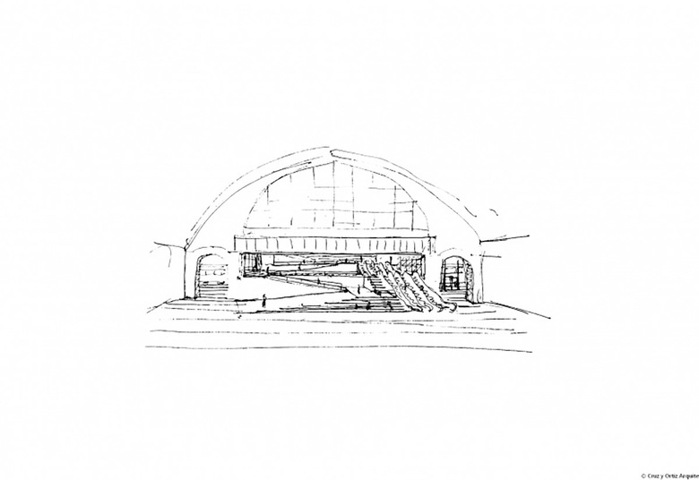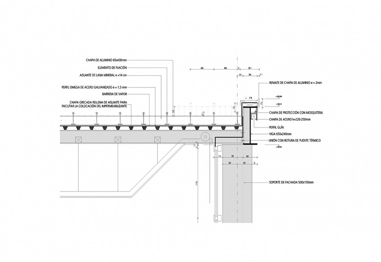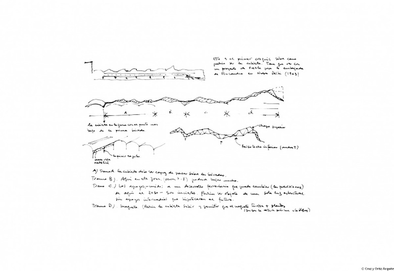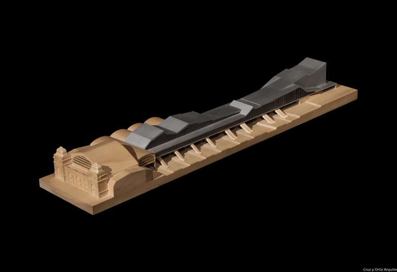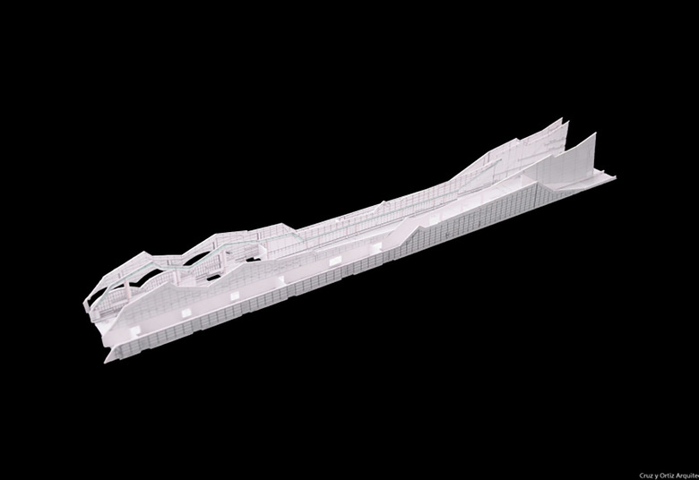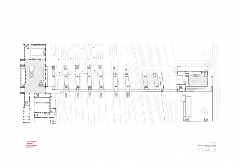 funcionamiento de la estación. Una losa de hormigón fue construida en el extremo Sur y posteriormente desplazada sobre los andenes a un ritmo de un andén cada tres semanas. La inclinación de los paños de la cubierta -quebrados hasta definir un perfil casi topográfico- proporciona a cada uso una altura específica, facilitando el acuerdo con las marquesinas existentes sobre los andenes. Con este gesto se mantiene la continuidad de la secuencia espacial, transversal al tránsito de viajeros que caracteriza el proyecto y que culmina en un importante volumen de cabecera en el lado opuesto del vestíbulo existente y en una nueva plaza sobre un aparcamiento