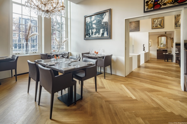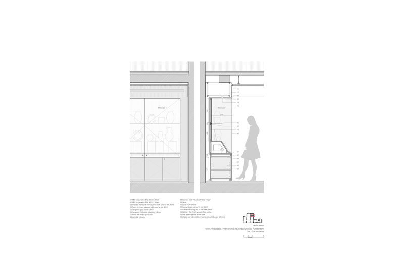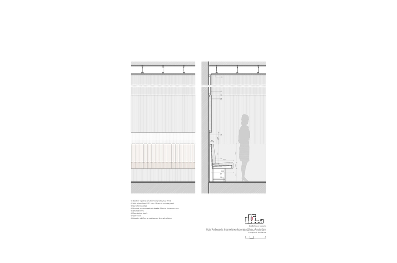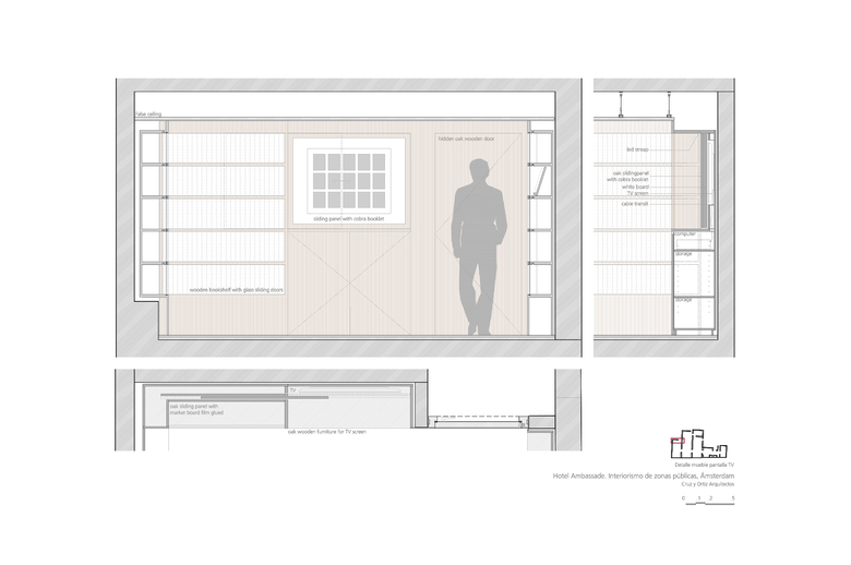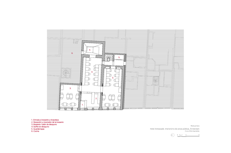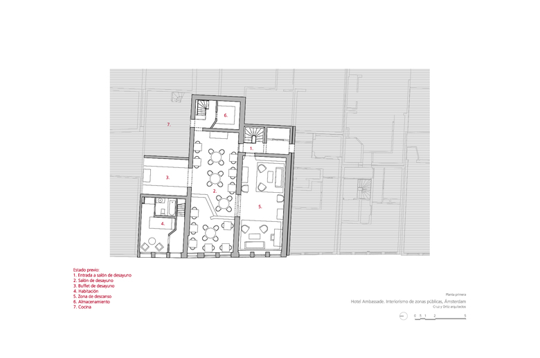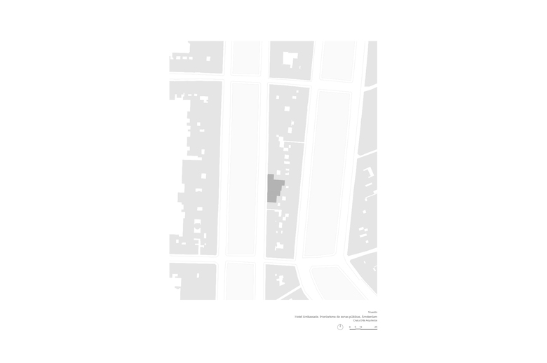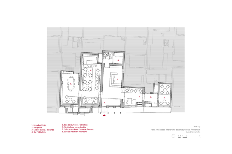 El primero de todos, que la muy relevante colección Cobra, propiedad del hotel, estuviera más accesible para los clientes. En segundo lugar, el Hotel Ambassade es visitado muy a menudo por escritores que suelen donar al hotel un ejemplar original firmado por ellos. Por este motivo, el hotel cuenta con una biblioteca de más de 4000 libros únicos. Por último, la creación de un lounge bar, lo suficientemente pequeño como crear un ambiente íntimo y una nueva brasserie (un nuevo restaurante) en la primera planta. Teniendo en cuenta la situación anterior, una de las primeras medidas a tomar era reorganizar los espacios. Algunas de las características especiales de las casas se habían perdido debido a modificaciones anteriores en el edificio, dando como resultado un espacio algo amorfo. La suma de decisiones inconexas tomadas a lo largo de los años ha supuesto una pérdida en la coherencia de la estructura original de las casas en el canal. Por lo tanto el primer paso era dotar a los espacios de geometría y claridad. La sucesión de pasajes alineados contemplados en la propuesta de diseño facilita el tránsito de una casa a otra, como un paseo a través de secuencias de espacios en los que uno puede reconocer de nuevo las casas originales. Al recuperar la orientación espacial, las zonas públicas del hotel se perciben de una manera más sosegada.