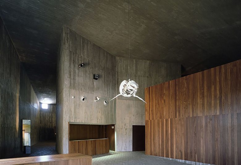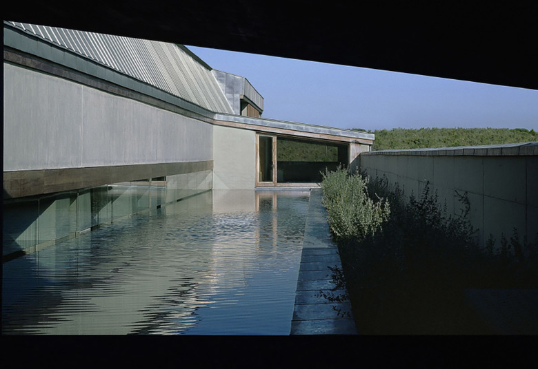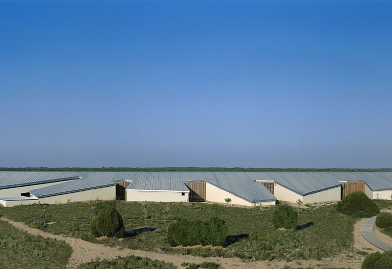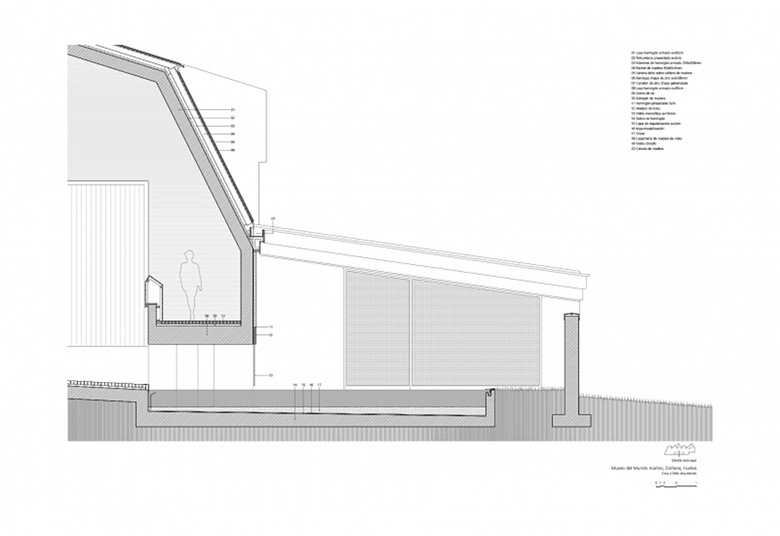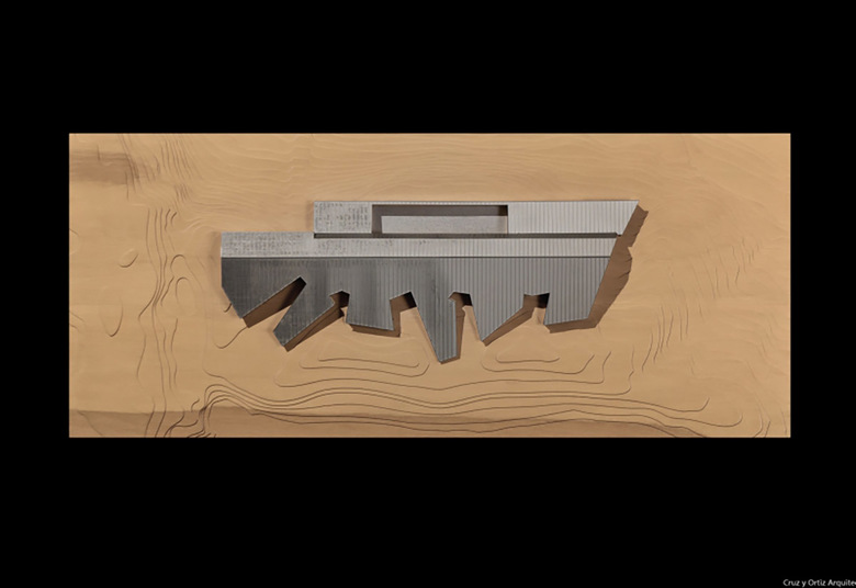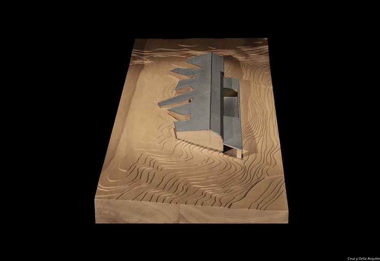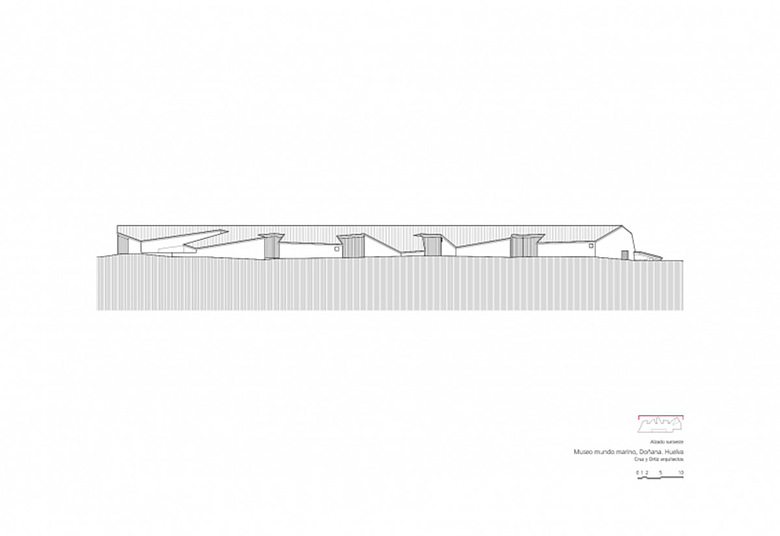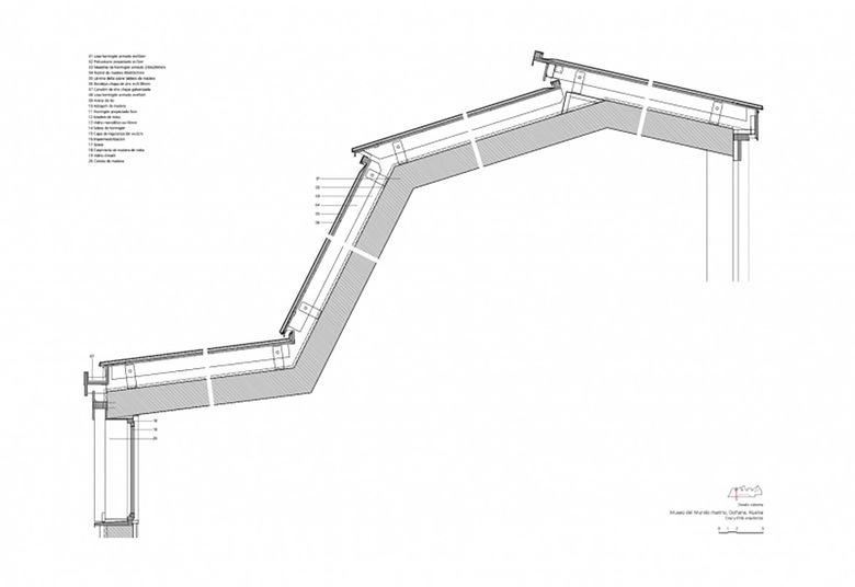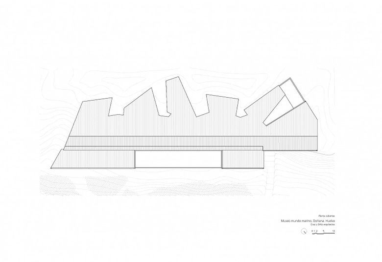 La diversidad funcional y formal de los distintos espacios que constituyen el Centro queda unificada por una cubierta que, con sus distintas pendientes, establece relaciones con el paisaje dunar circundante. La expresividad de la planta, al intersectarse con este plano inclinado, se manifiesta en la cubierta a través de una arista quebrada que dibuja el volumen del edificio.