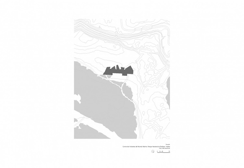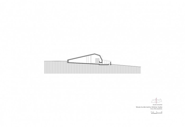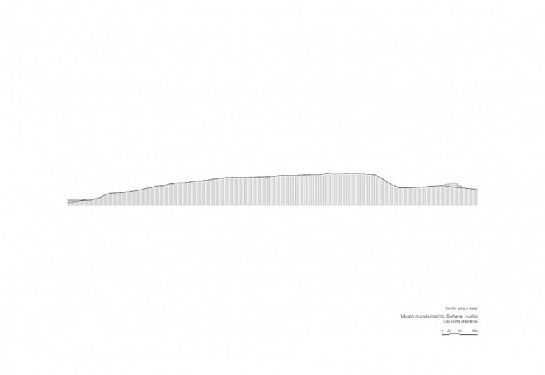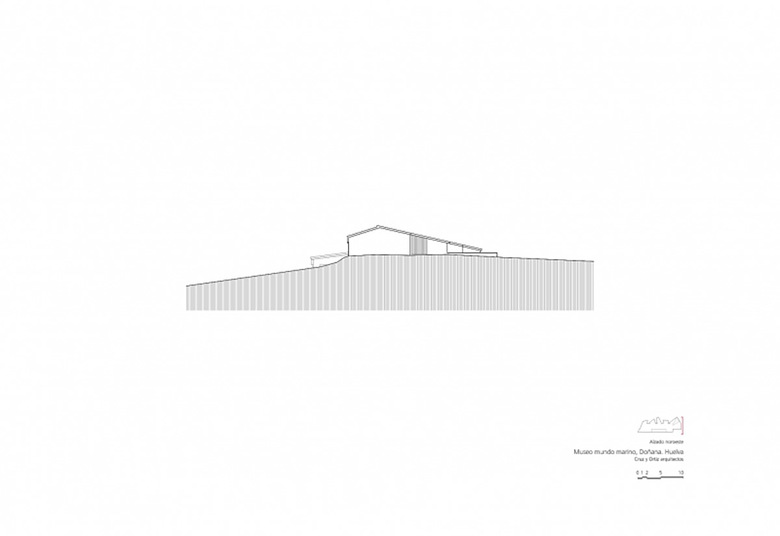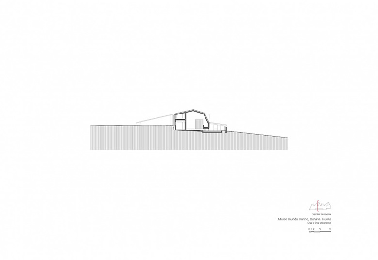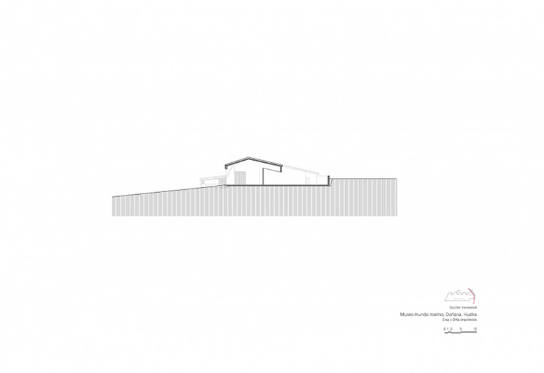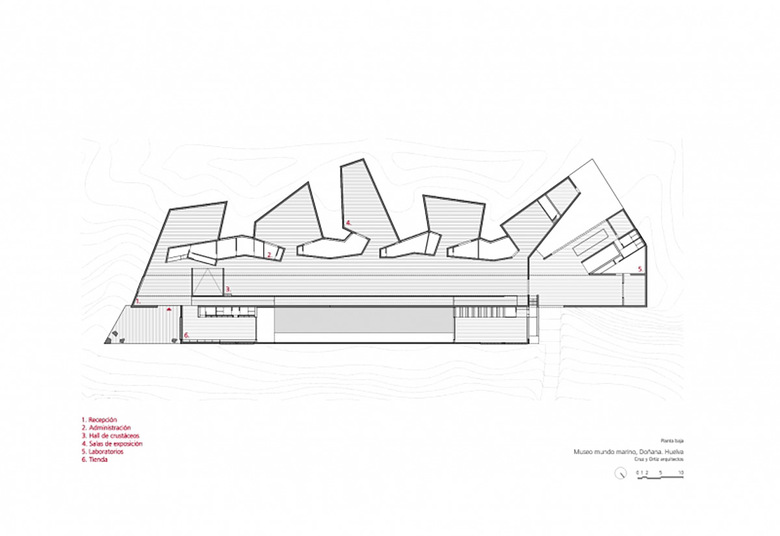 El edificio se asienta sobre un sistema de dunas que queda separado de la playa por un zócalo de arenas que alcanza treinta metros de altura. Se trata de una edificación aislada y singular, semienterrada con respecto a las cotas más elevadas de la parcela, buscando así su integración en el paisaje. Una planta geométricamente compleja que se intercepta con una sección homogénea, genera los espacios interiores necesarios para alojar un pequeño museo dedicado al mundo marino.