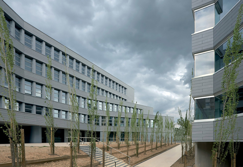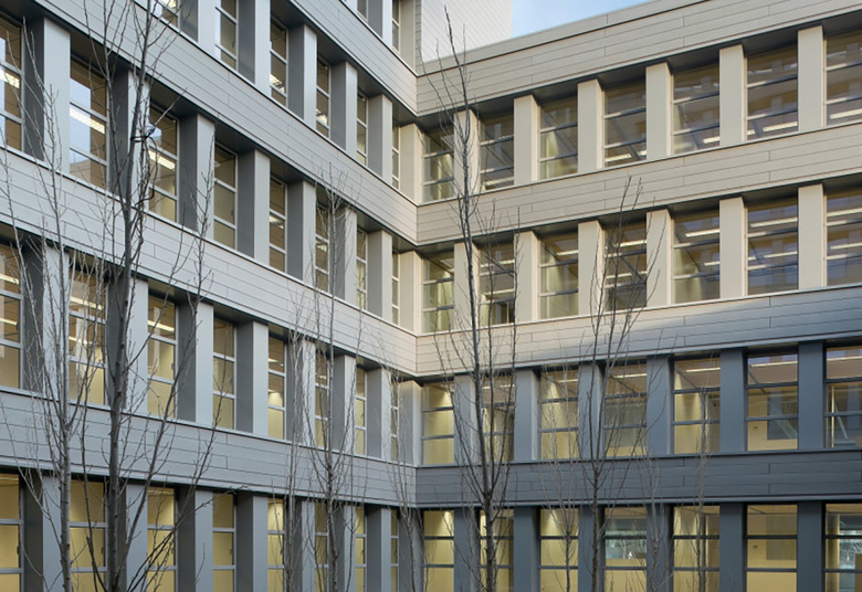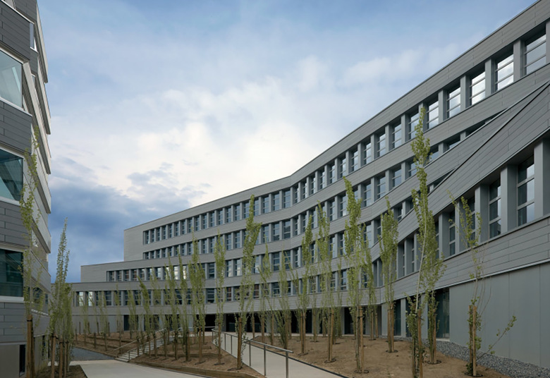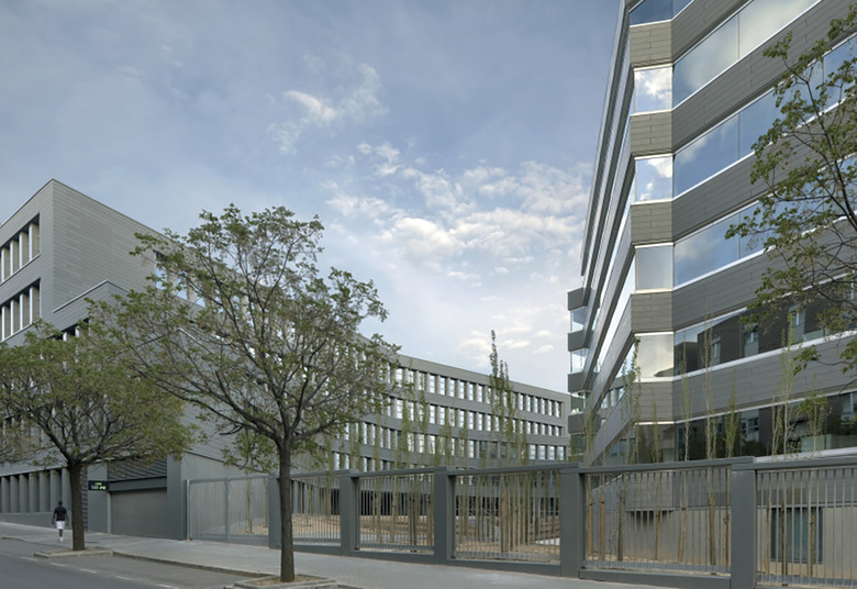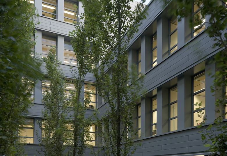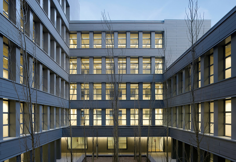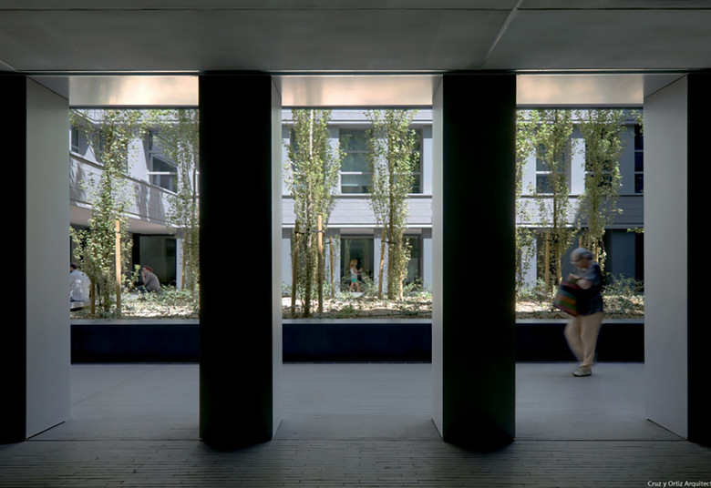 Todo ello ha conducido a proyectar un edificio muy autónomo en la configuración de su perímetro que evita replicar ninguna de las alineaciones próximas. El edificio, además, genera su forma a partir de un nuevo lugar, un patio de geometría precisa que ocupa el centro del edificio y a partir del cual se organiza todo el conjunto: en efecto, toda la edificación se desarrolla en torno a este espacio, subiendo en altura progresivamente y alcanzando tres, cinco, siete o nueve plantas según los cuatro lados del rectángulo del patio. En resumen, el edificio se presenta autónomo respecto a las alineaciones exteriores y se genera a partir de su centro, a partir del nuevo lugar creado.