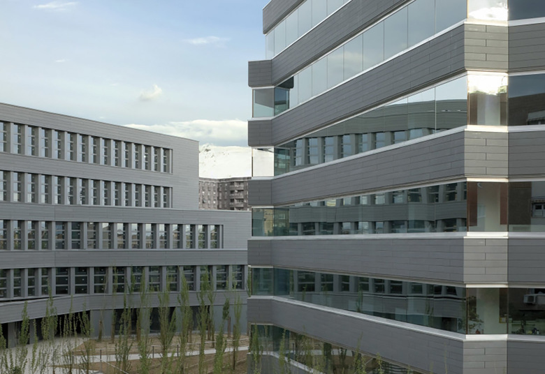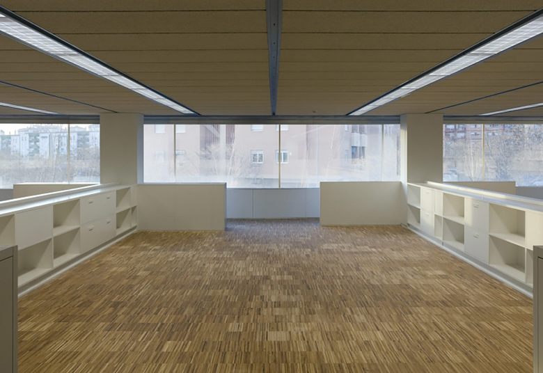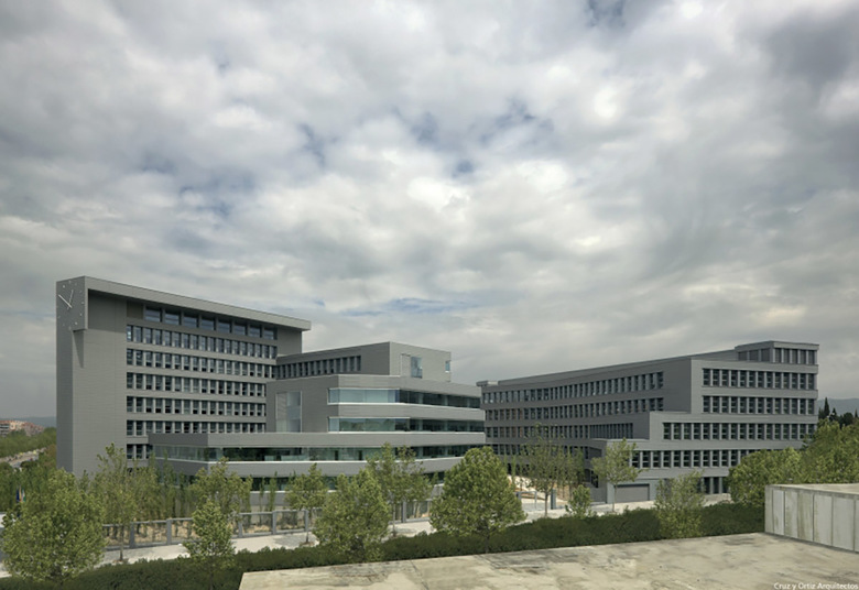 Al complejo se accede desde el sur y tras pasar controles y porches, se descubre el patio que constituye para el visitante un hallazgo inesperado. Desde el patio se alcanzan los distintos núcleos de circulación vertical. La influencia del espacio central y su valor organizativo alcanza incluso a la disposición de las oficinas en las plantas, al agrupar los despachos en torno al patio mientras las zonas externas, de geometría más irregular, vienen ocupadas por oficinas de organización abierta.