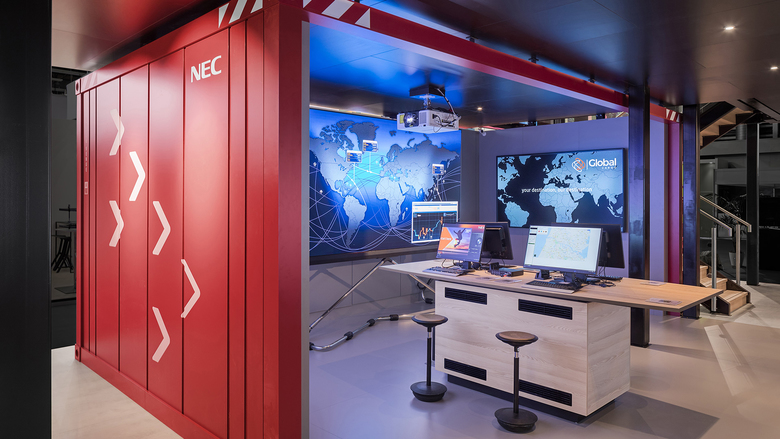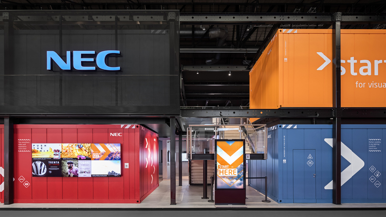 Das Motto „Start here“ als Aufruf zum Aufbruch wird, nach außen hin, durch die unverwechselbare Optik von Übersee-Containern visualisiert. Im Ergebnis bietet sich dem Besucher eine auffällige und aufregende Reise durch die Markenwelt von NEC.