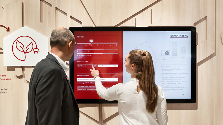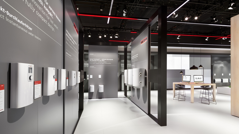 Die Produktausstellung wurde in drei Zonen aufgeteilt. In den Bereichen "Warmwasser", "Modernisierung" und "Neubau" können Lösungen Stiebel Eltrons live am realen Produkt und in Verbindung mit Touch-Anwendungen betrachtet werden.