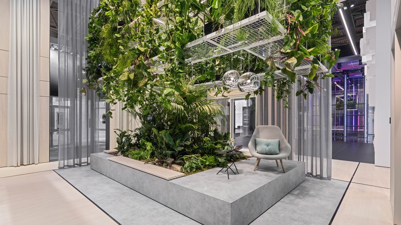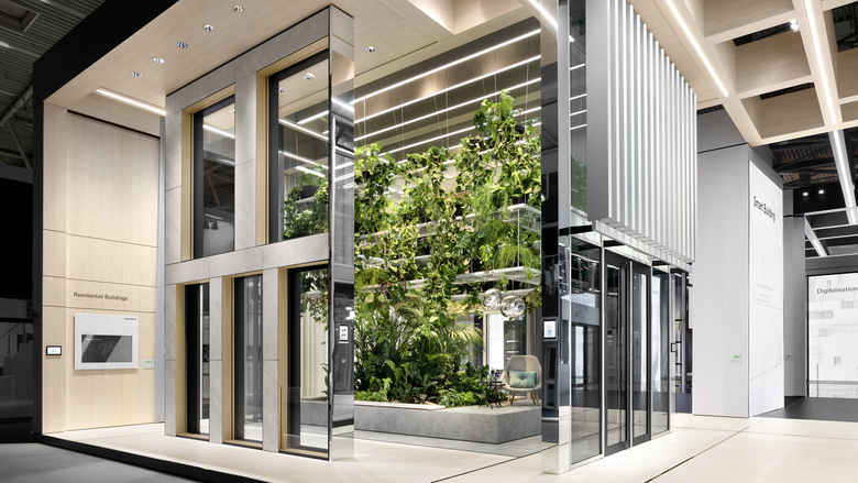 Anhand zweier raumhoher Exponate werden die zentralen Themen Wohnbau und Objekt anschaulich in Szene gesetzt. Zum einen bildet eine Lichtinstallation in Verbindung mit verspiegelten Deckenfeldern eine abstrakte Darstellung vertikaler Dichte und Urbanität. Hängende Gärten hingegen bilden den Kontrast in der zweiten Installation und inszenieren, in Verbindung mit natürlichen Materialien, ein Gefühl des nachhaltigen Wohnens. An dieser Stelle wird für den Besucher emotional greifbar, was Schüco Produkte können und in Zukunft leisten werden.