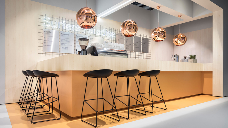 Das Obergeschoss wurde von Dart mit verschiedenen Bar- und Restaurantzonen ausgestattet. Hier bietet sich ausreichend Platz für vertiefende Gespräche. Großzügige Balkone und Glasfronten sorgen dafür, dass der Besucher zu jeder Zeit die Key Visuals der Ausstellungsfläche im Blick behält.