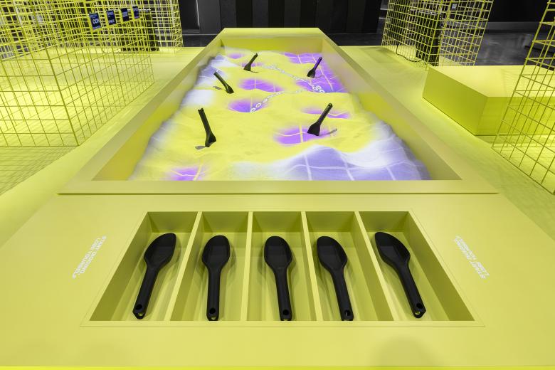 Im Zentrum steht das kommunikative Herzstück: Ein interaktiver Sandkasten, bei dem nicht die Berührung zählt, sondern die Tiefe. Was freigelegt wird, erscheint als neue visuelle Ebene. Mit jeder Schicht, die abgetragen wird, entstehen Zusammenhänge und Verbindungen. "Find what lies underneath“ ist Einladung und Philosophie zugleich. Schichten werden aufgebaut, abgetragen, geglättet und gleichzeitig verändert jede Bewegung den Inhalt. Jede Interaktion erzeugt neue Zusammenhänge. Was zunächst spielerisch beginnt, wird zur Metapher für den kreativen Prozess selbst: Erkenntnis entsteht im Tun.