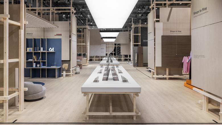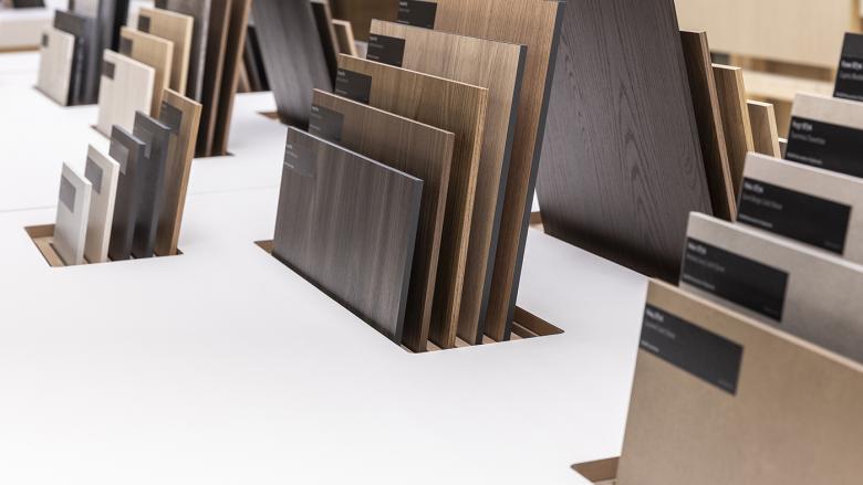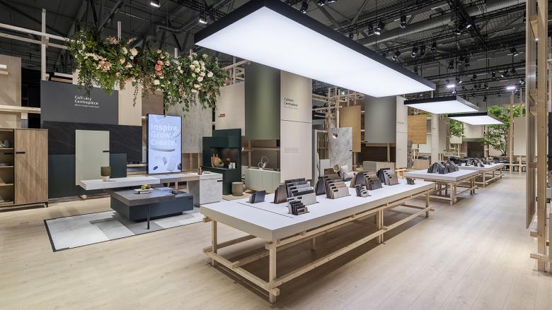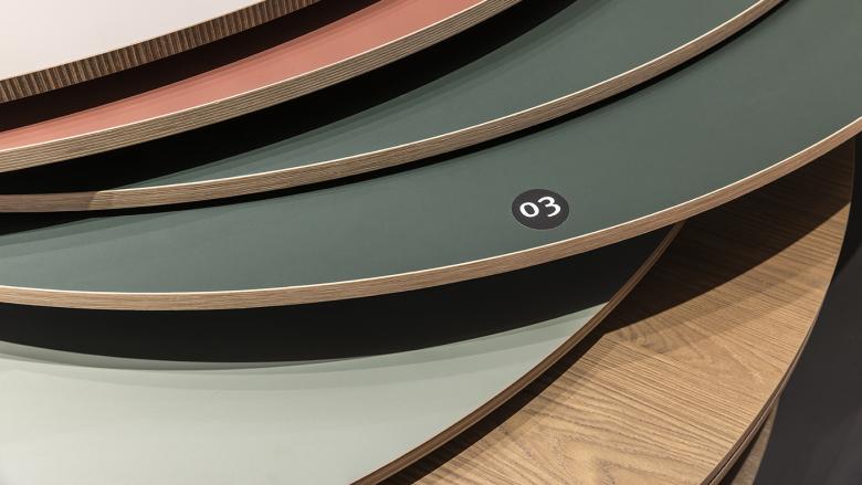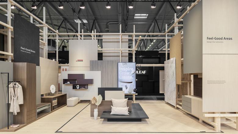 Ein Innovation Walk präsentiert die neuesten Oberflächen, während in den angrenzenden Studios praxisnahe Inspirationen für Anwendungen im Retail, Living Spaces, Kitchen, Office und Bath Rooms geboten werden. Die Ausstellung überzeugt durch ihre innovative Präsentation der Materialien – statt klassischer Musterboards werden Oberflächen in raumgreifende Installationen integriert, Materialien sind als vollflächige Erlebnisse inszeniert. Die Anwendungen im Innenausbau oder Möbeldesign sind oft nur angedeutet, um dem Fachpublikum ganz bewusst Raum für eigene Interpretation und kreative Einsatzmöglichkeiten zu lassen. Zusätzlich wird die umfangreiche Oberflächenkollektion am zentralen LAB Table konzentriert gezeigt – zum Anfassen, Prüfen und Verstehen.