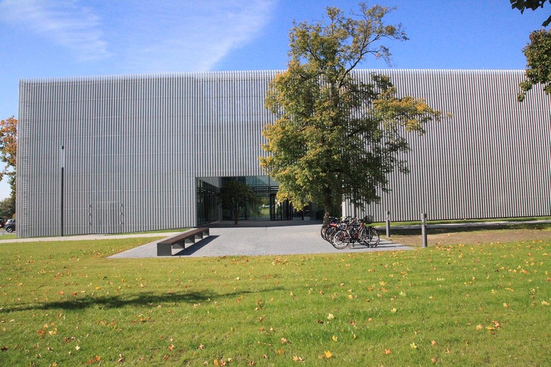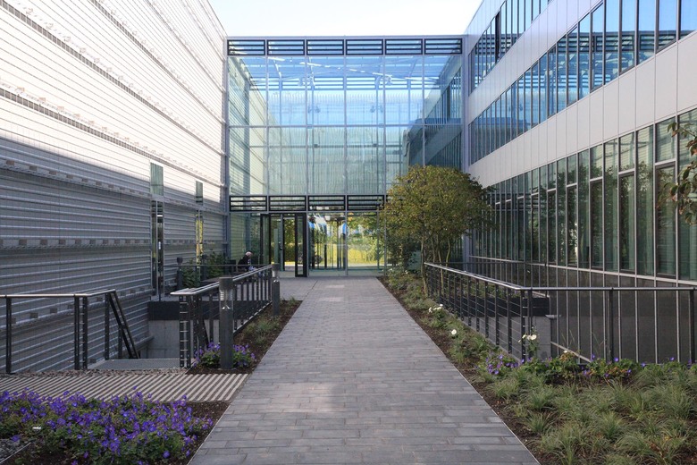 Der Neubau des Forschungsinstituts ist eingebettet in die weiträumigen städtischen Grünflächen des Stadtteils `Heide-Süd´. Den aus 2 Baukörpern bestehenden Komplex umhüllt eine Stahlblechfassade, die sich im Westen und Osten öffnet und den Innenhof als linearen Zwischen-Raum mit den umgebenden Freiflächen verknüpft. Die Weite der Grünflächen von `Heide-Süd´ mit Großbäumen und Pflanzungen verdichten sich im schmalen Band zwischen den Baukörpern. `Komprimierte´ Natur stellt sich dar mit Hainbuchen, die in enger Verbindung mit der Architektur als Formgehölze einerseits Baum und andererseits Gestaltungselement sind, weiteren Solitärsträuchern und einer Unterpflanzung mit Gräsern und Stauden.