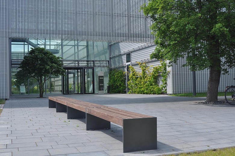 Den Eingangs- und Aufenthaltsbereich kennzeichnet ein dunkler Plattenbelag, der im Kontrast zur hellen Metallfassade steht. In Anlehnung an die streng geometrische Architektur sind auch die Stellflächen und Anlieferungsbereiche als funktionale Einheiten geradlinig gestaltet und eng mit den Erfordernissen der Gebäudestruktur verknüpft. Als Außenlager für Verbrauchsmaterialien, Geräte, Müllbehälter und als Fahrradunterstand befindet sich im Bereich der westlichen Freiflächen ein Außenlager, dessen Stahlkonstruktion mit einer Fassade aus Aluminium-Verbundplatten verblendet ist.