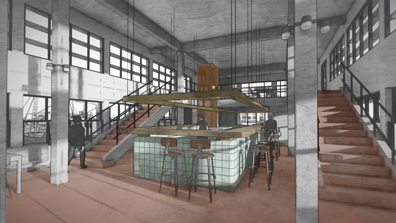 De massief vanzelfsprekende kern omvat keuken, zitplaatsen voor eet en drank gelegenheid, verkooppunt passanten en wordt verticaal ontsloten door een in transparant strekmetaal ommantelde lift, afgewerkt in industrieel oranje, een kleur die verwijst naar maritieme elementen zoals kranen, touwen en boeien.