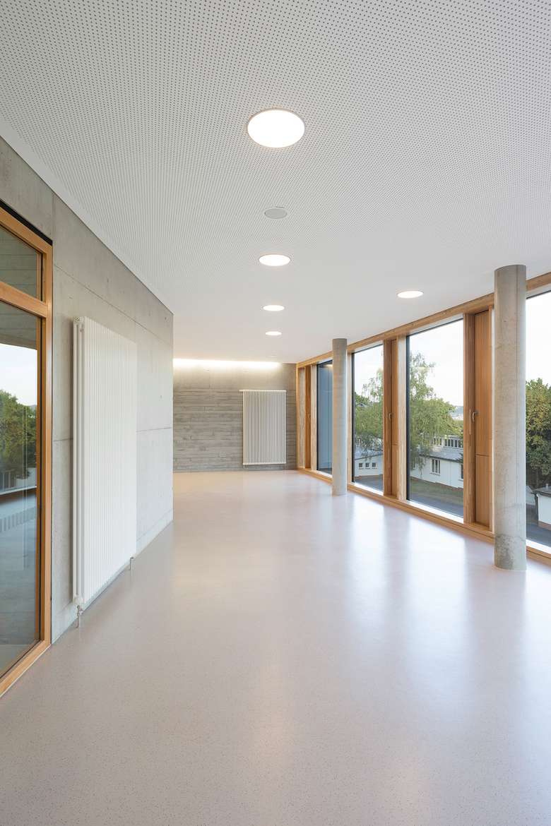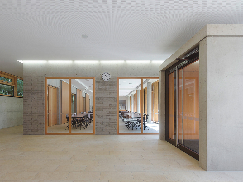 Eine Schulanlage aus den 50-er Jahren mit dreigeschossigem Hauptbau und eingeschossigen Pavillonbauten war um eine Mensa, Schüleraufenthalts- und Fachklassenräume für Biologie und Physik zu erweitern. Der Neubau schließt direkt an den winkelförmigen Hauptbau an. Ein Zwischenglied nimmt den neuen Eingangsbereich, Treppe, Aufzug und WC-Räume auf. Der im Altbau südseitig angeordneten Flur wird hier auf die Nordseite des Neubaus umgeleitet, damit alle neugeschaffenen Räume in den Genuss der Südsonne und des Ausblicks in die grüne Mitte des Schulgeländes kommen. Die Mensa mit 96 Tischplätzen und eine Aufwärmküche liegen im Sockelgeschoss, die Schüler-aufenthaltsräume im mittleren Geschoss, die beiden Fachklassen und ein Vorbereitungsraum im Obergeschoss. Putzbänder im Deckenbereich gliedern die Fassaden aus geschosshohen Verglasungen und Faserzementplatten.