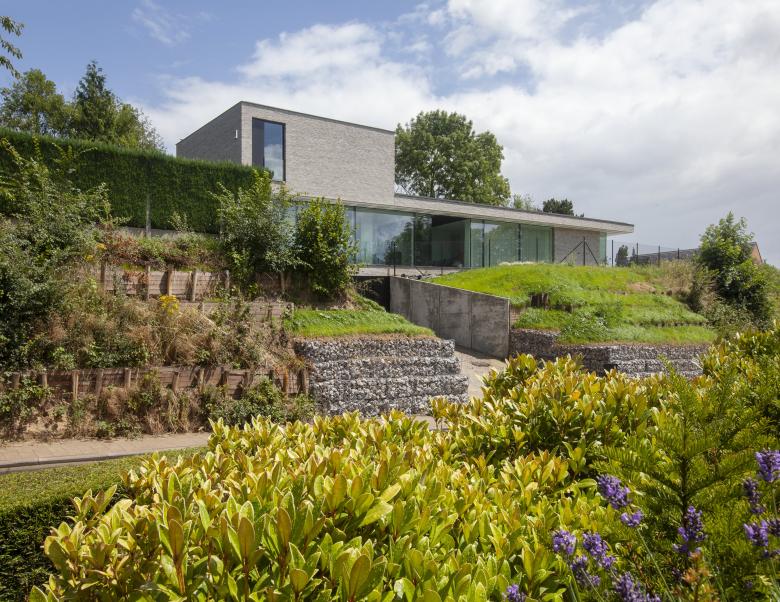 Een langgerekt en ondiep perceel in een talud vormde de belangrijkste ontwerpparameter voor dit ontwerp. De plannen passen een 30m lange en amper 5,5m diepe woning op het uitdagende perceel. Omwille van de zuidelijke oriëntatie van de straat presenteert de woning zich met een heel open voorgevel naar de omgeving. Ook de voortuin werd optimaal benut voor de gezinsbeleving. Privacy is geen issue in deze aanpak, aangezien het perceel zich meer dan 4m boven het straatniveau uit tilt.
