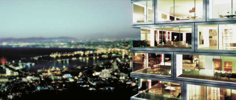 Um den Kern des Turms liegen pro Geschoss 4 bis 8 Wohnungen, manche als Maisonettes, mit Größen von 60 bis 220 Quadratmetern. Was eben mit den Breit- oder Schmalseiten von Containern verglichen wurde, sind Verbundkastenfenster. Die Lüftung einer jeden Wohnung erfolgt zum Teil auf natürliche Weise, einerseits durch Schiebetüren, die auf die Loggia führen, anderseits durch Fensterklappen. Aus den oberen Etagen geht der Blick nach Norden auf die Berge, nach Süden auf das Meer, nach Westen auf den Hafen.