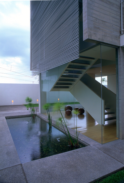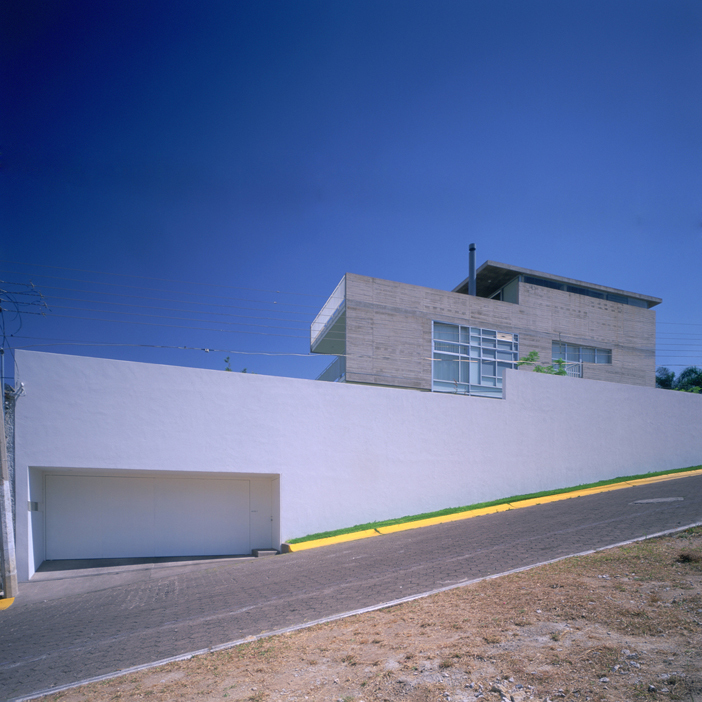 Los volúmenes de la casa se dividen en dos, el primero - de concreto aparente-, donde se ubica el ingreso, la escalera y la estancia en el primer nivel, una estancia familiar y la recamara principal en el segundo y un salón de usos múltiples con una terraza en el tercero; el segundo volumen - como contrapunto del primero -, se ubican el resto de los espacios; comedor, cocina, servicios y recamaras.