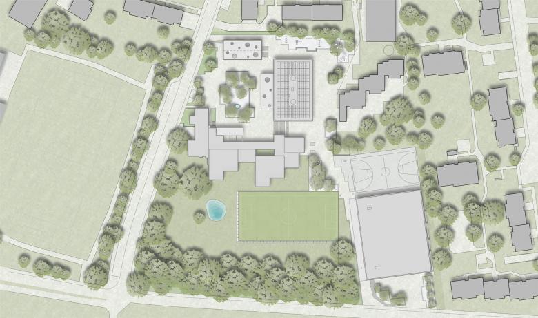 Die Schulanlage erhält durch die Setzung der Neubauten attraktive Adressen und ein gestärktes inneres Rückgrat. Der Hauptzugang am Leeweg wird durch einen grosszügigen, räumlich gefassten Pausenplatz gestärkt. Der Neubau der Turnhalle bildet an der Erachfeldstrasse eine neue Adresse. Das viergeschossige Schulhaus im Innern des Areals schafft eine klare Zonierung in einen oberen Pausenplatz und eine untere Aussenraumfolge, welche die Anlage durchlässiger macht und gleichzeitig stärker zusammenbindet.