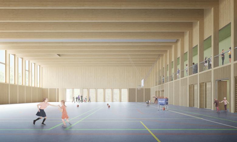 Das neue Schulhaus nimmt als einfaches und klares Volumen, aber mit räumlich differenziertem Innenleben, Bezug auf seine Stellung am Geländesprung zwischen oberer und unterer Pausenplatzebene. Auf beiden Ebenen befinden sich Eingänge und Räume mit direktem Aussenbezug. Die Statik des Gebäudes aus sechs Stützen, wenigen aussteifenden Kernen und Wänden sowie einer tragenden Fassade aus feingliedrigen Holzstützen ermöglicht eine maximale Flexibilität für zukünftige Anpassungen.