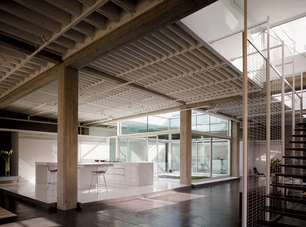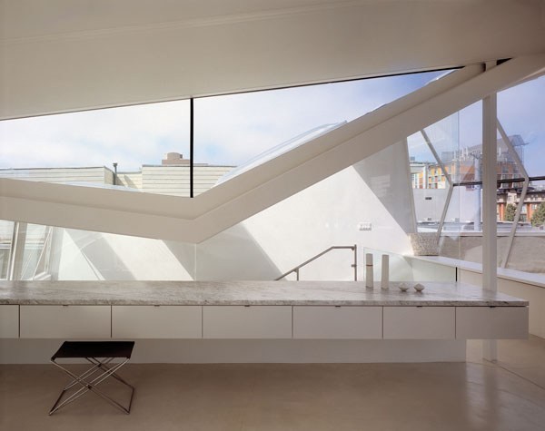 The airy third-floor penthouse addition is the centerpiece of the design. The geometry of this sculptural object is a deliberate contrast to the orthogonal grid of the existing concrete structure.