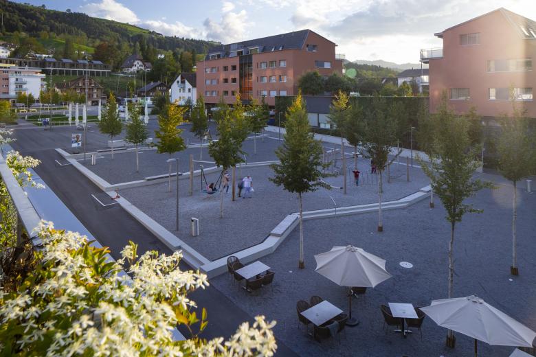 Auf der Weihermatte erhält Malters einen zentralen Dorfplatz in Bahnhofsnähe. Der abwechslungsreich strukturierte Freiraum ist als zusammenhängendes, parkähnliches Band mit unterschiedlichen Aufenthaltsqualitäten ausgestaltet. Baumdächer im Norden und Süden des Areals bilden einen grünen Filter zur Hauptstrasse und zum Bahnhof hin. Gleichzeitig entstehen unter dem lichten Schatten der Bäume Ruhe- und Rückzugsorte mit mobilen Sitzwürfeln, Bänken und Rasenflächen, einem geschwungenen Wegnetz und einem Wasserspiel. Im Zentrum des Platzes bleibt eine grosszügige Fläche frei für Märkte, Feste und Veranstaltungen der Dorfbevölkerung. Das Rückgrat des Platzes bilden angrenzende Gebäude mit Ladenflächen im Parterre.